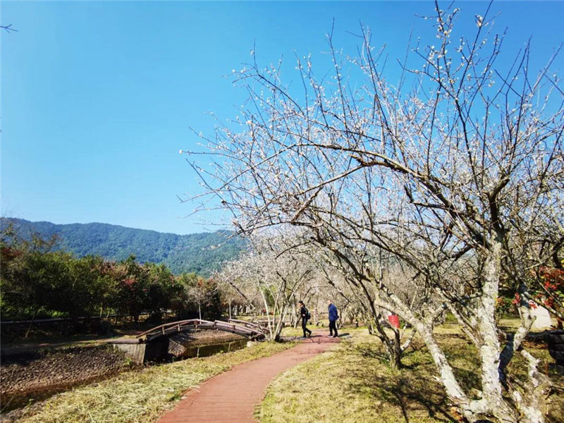 八寨溝梅園四周青山環(huán)繞,鳥語(yǔ)花香,當(dāng)梅花盛開時(shí),漫山遍野的梅花與青山綠水交相輝映,宛如世外桃源;當(dāng)你置身其中,極目望去,朵朵梅花在艷陽(yáng)冷風(fēng)中傲然綻放;遠(yuǎn)望,一樹繁花似錦如雪,近賞,朵朵白梅挺立枝頭,小巧的花瓣,精致的花蕊,潔白無(wú)瑕,成群的蜜蜂在花間縈繞。