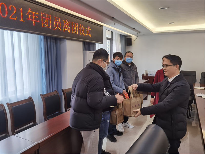 (圖為團委書記黃耀世傳達學習十九屆六中全會精神) 離團團員逐個發(fā)表了離團感言,回憶了與共青團共同成長的心路歷程,通過自己在思想和工作中的進步及收獲,勉勵團員青年們不忘初心、奮勇前進,并紛紛表示將一如既往的努力工作,勇挑重擔,積極向黨組織靠攏,在集團轉型升級中揮灑青春,不懈奮斗。耀世書記帶領滿齡團員們重溫了入團誓詞,為他們摘下團徽,贈送了《中國共產黨章程》,儀式在一起奏唱國歌中拉下帷幕。 (圖為團委書記黃耀世帶領離團團員重溫入團誓詞) 集團公司黨委卜玉聲副書記為離團青年贈送離團紀念品,充分肯定了集團公司團委所取得的成績,肯定了青年團員對集團公司發(fā)展、黨委工作開展的支持和努力,并對團員青年們提出三點希望。一是政治上要持續(xù)進步。共青團作為黨的助手和后備軍,廣大團員青年要追求共產主義信仰,積極向黨組織靠攏;二是業(yè)務上要持續(xù)提升。廣大青年要立足本職崗位,堅持不懈鉆研業(yè)務,勤奮工作,積極作為;三是素質上要持續(xù)提高。廣大青年要不斷提高個人品格和綜合素養(yǎng),拓展人生的寬度和厚度,多學習多讀書,加強黨史學習教育,樹立正確的價值取向,多為集團公司轉型發(fā)展出謀劃策。 (圖為集團公司黨委副書記卜玉聲為離團團員發(fā)放紀念品并作重要講話)