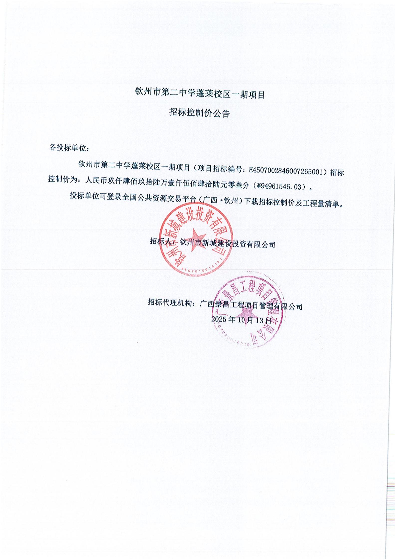 欽州市第二中學(xué)蓬萊校區(qū)一期項(xiàng)目招標(biāo)控制價(jià)公告