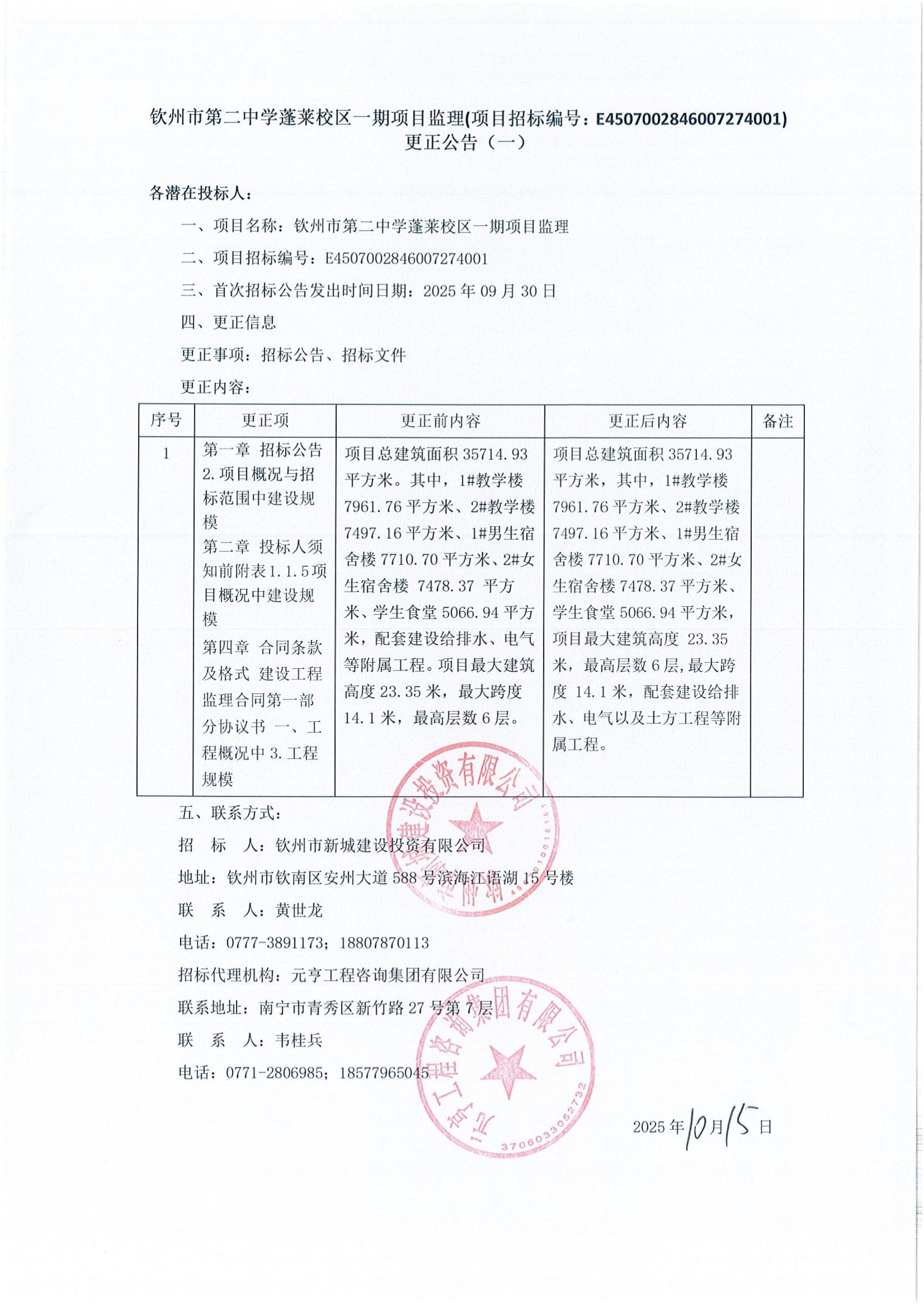 欽州市第二中學(xué)蓬萊校區(qū)一期項(xiàng)目監(jiān)理(項(xiàng)目招標(biāo)編號(hào):E4507002846007274001)更正公告(一)