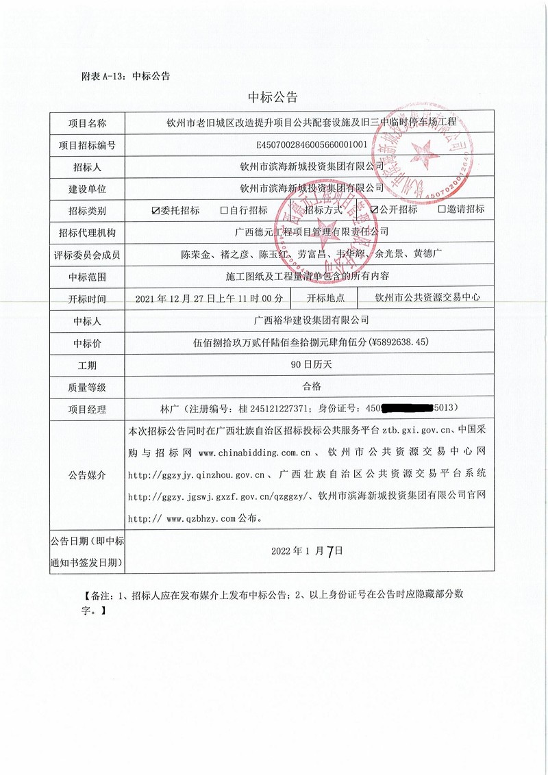 中標(biāo)公告-欽州市老舊城區(qū)改造提升項(xiàng)目公共配套設(shè)施及舊三中臨時停車場工程