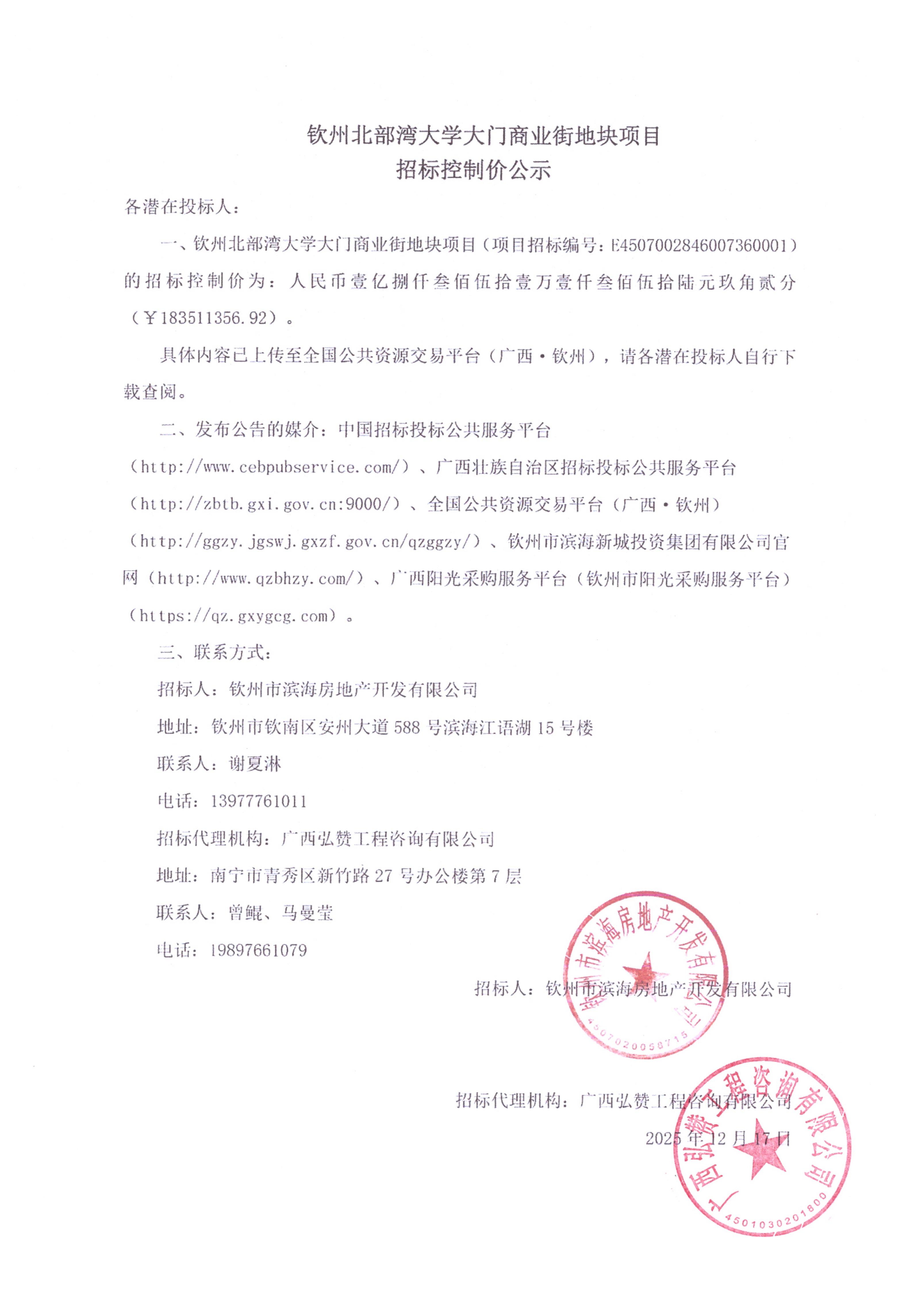 欽州北部灣大學(xué)大門商業(yè)街地塊項(xiàng)目招標(biāo)控制價(jià)公示