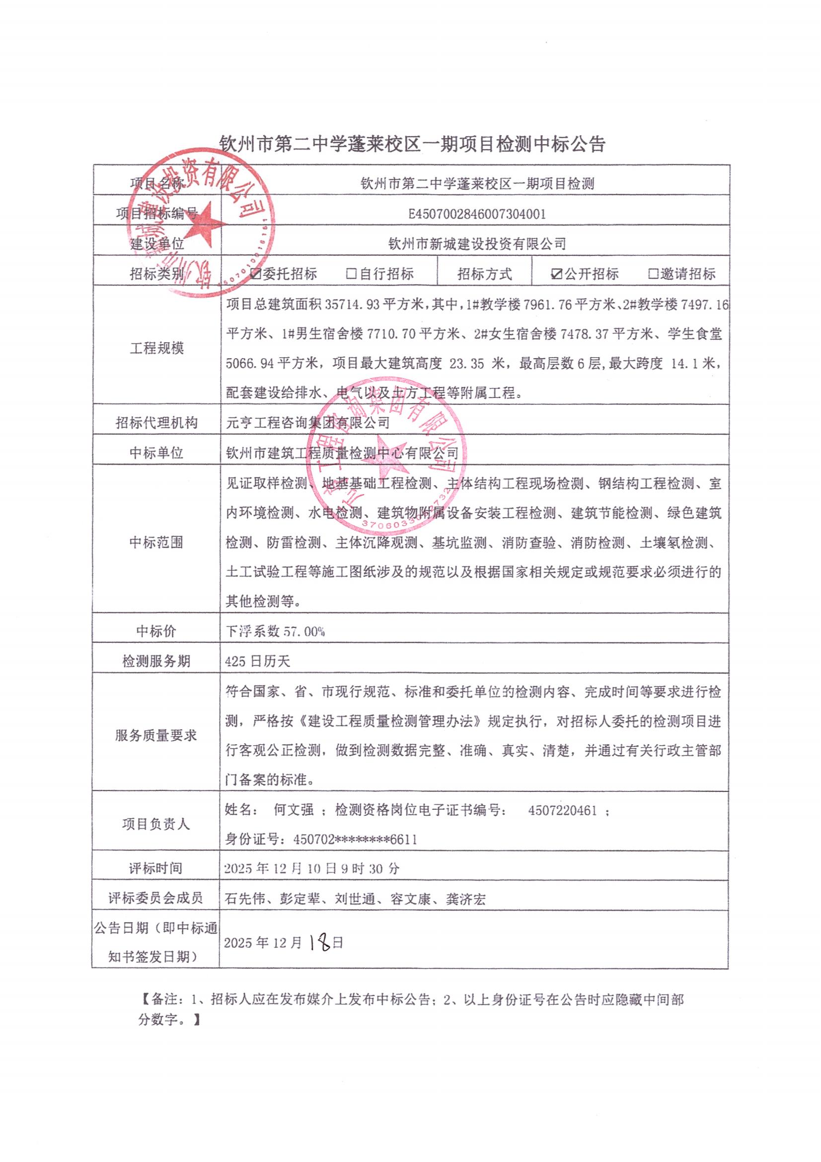欽州市第二中學(xué)蓬萊校區(qū)一期項(xiàng)目檢測(cè)中標(biāo)公告