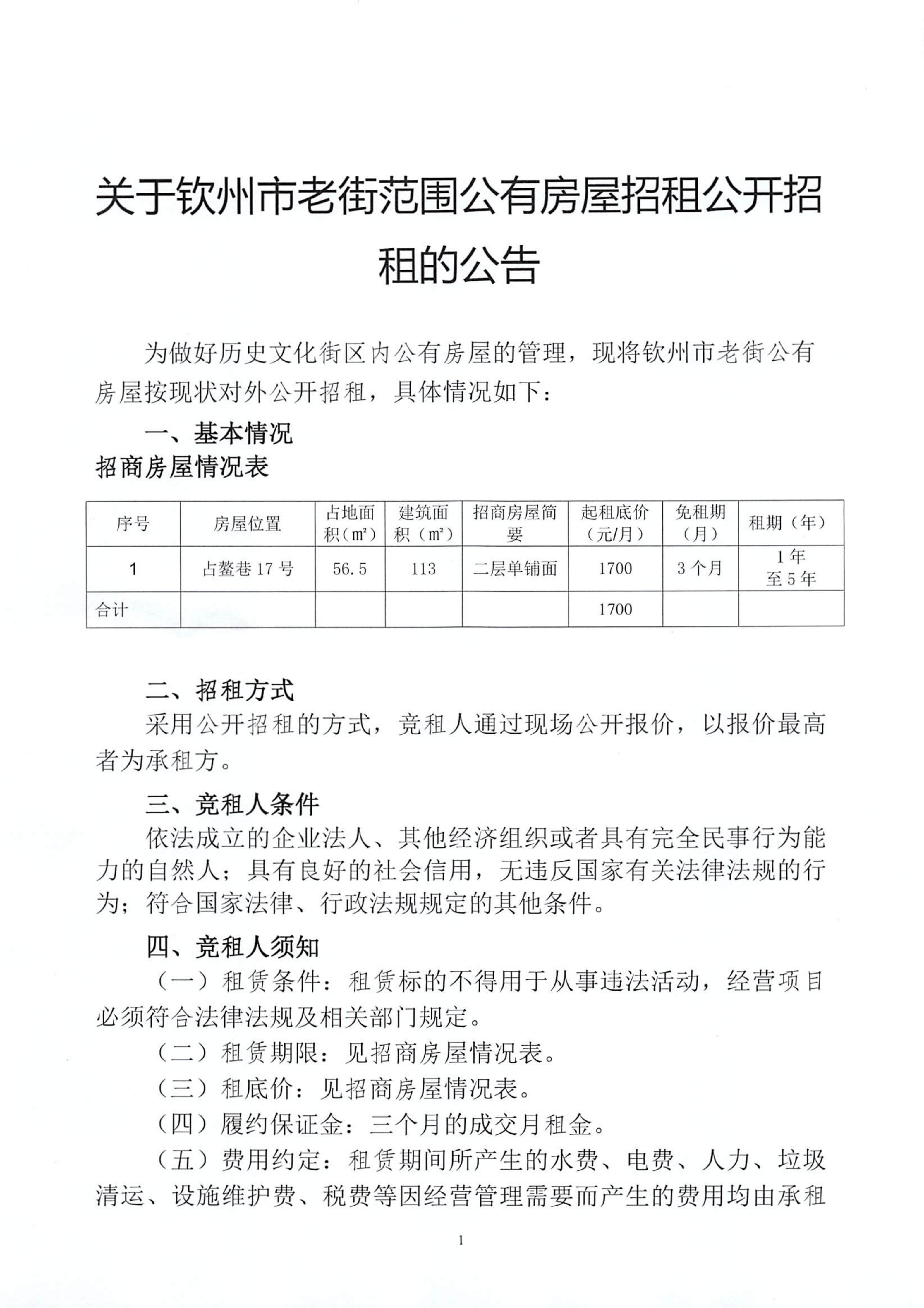 關于欽州市老街范圍公有房屋招租公開招租的公告