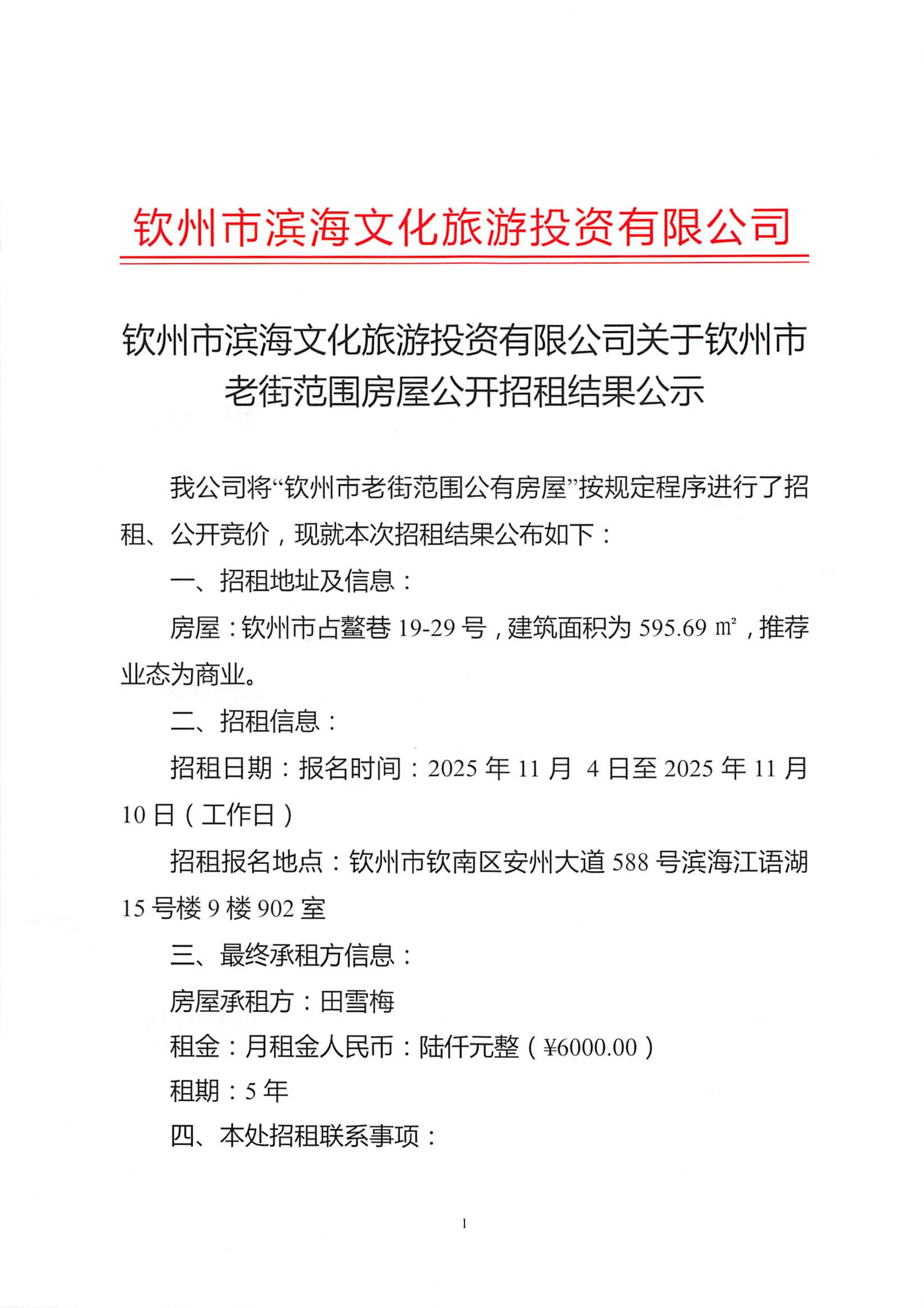 欽州市濱海文化旅游投資有限公司關于欽州市老街范圍房屋公開招租結果公示(欽州市占鰲巷19-29號)