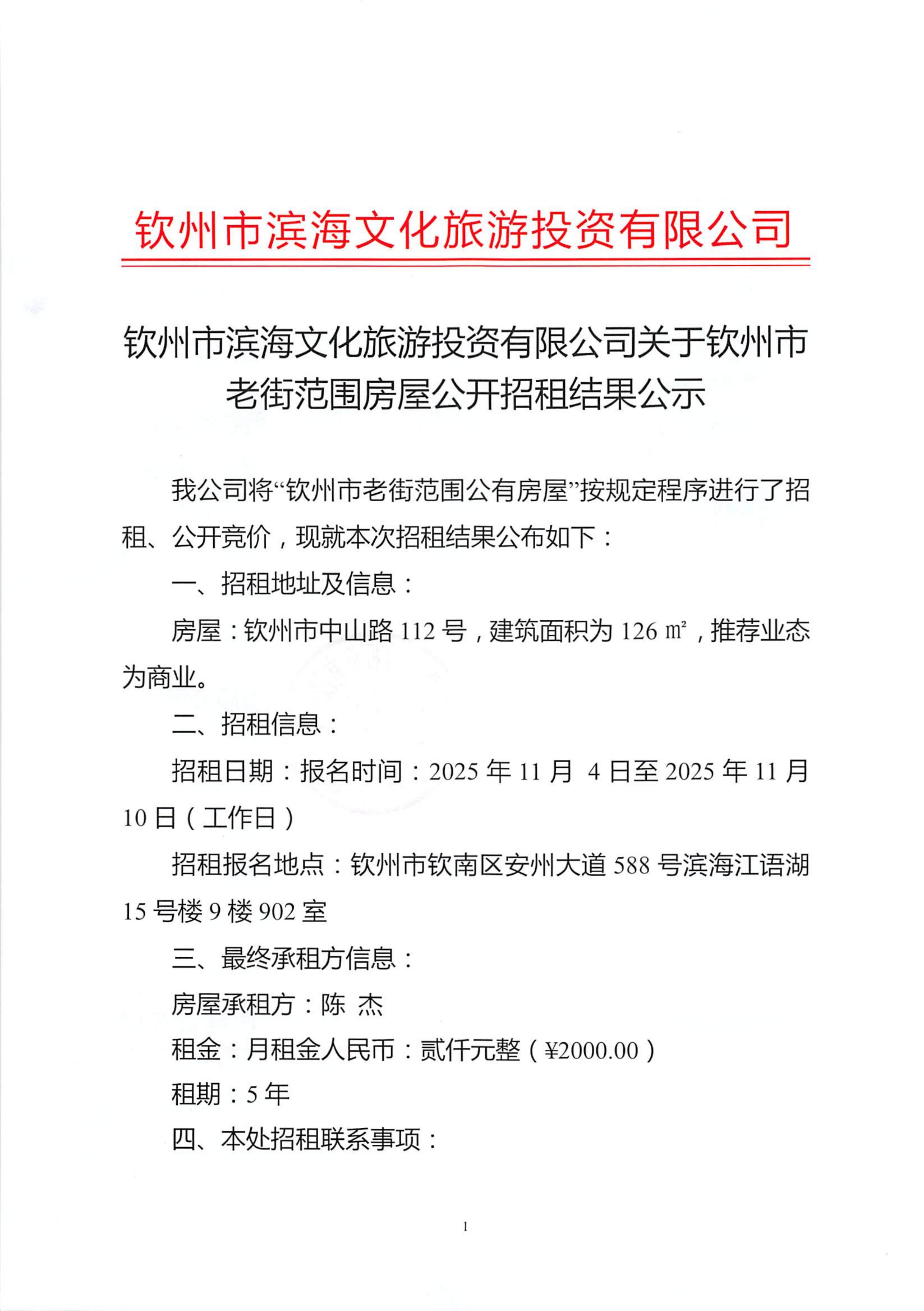欽州市濱海文化旅游投資有限公司關于欽州市老街范圍房屋公開招租結果公示(欽州市中山路112號)