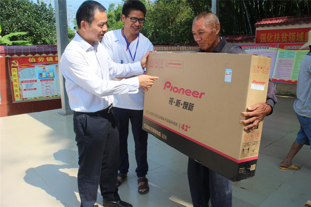 圖為集團公司總經(jīng)理覃世金為貧困戶發(fā)放電視機