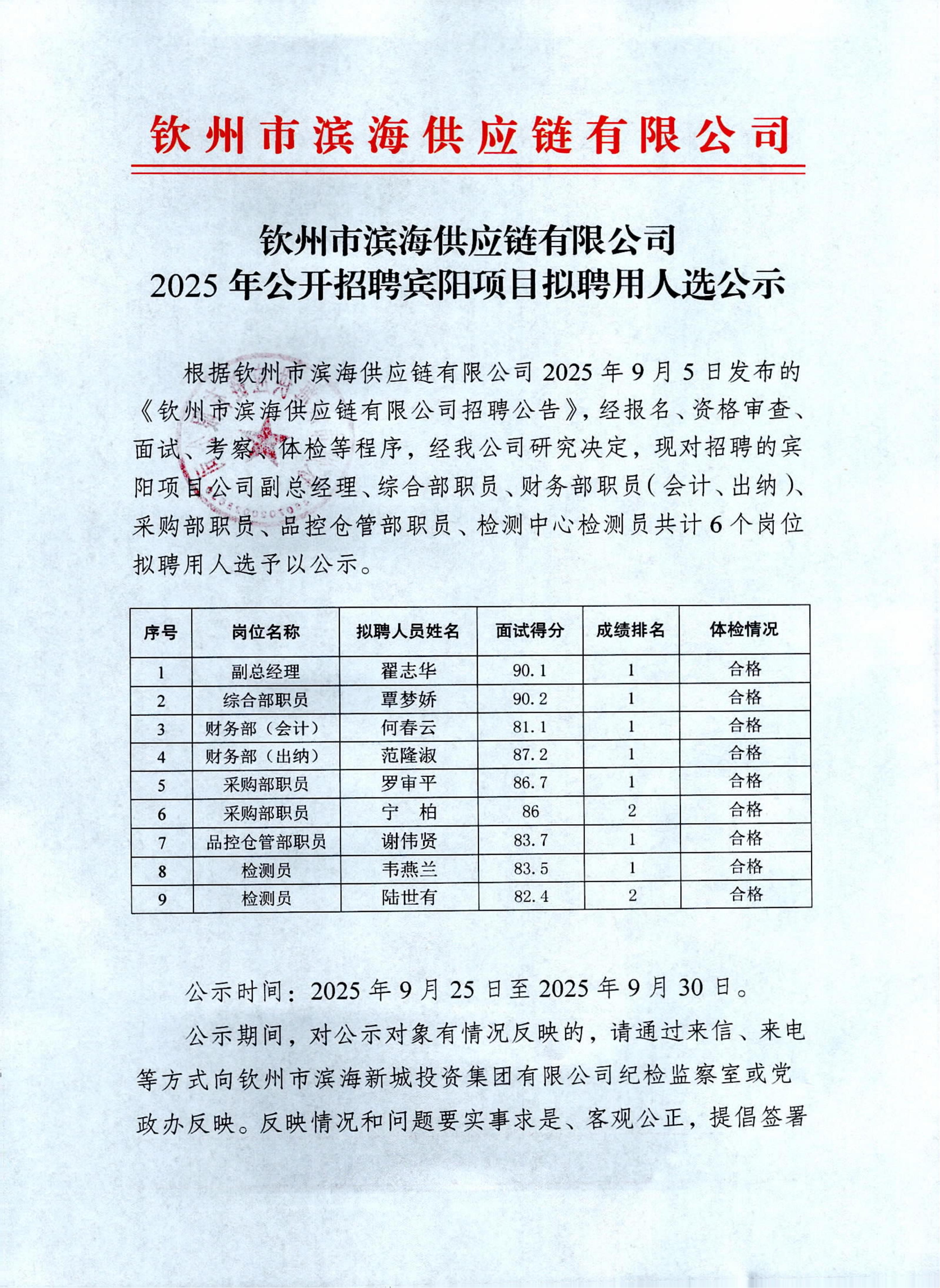 欽州市濱海供應鏈有限公司2025年公開招聘賓陽項目擬聘用人選公示
