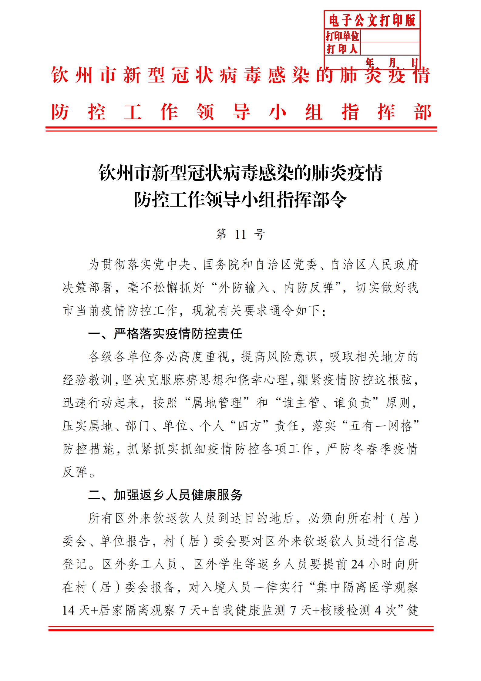 欽州市新型冠狀病毒感染的肺炎疫情防控工作領導小組指揮部令(第11號)