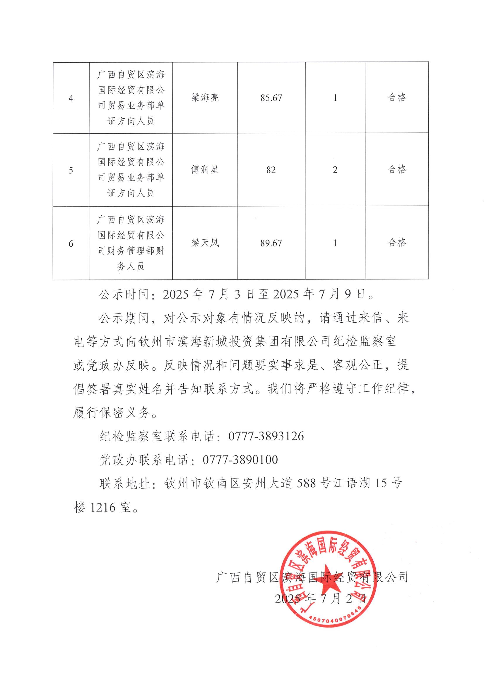 廣西自貿(mào)區(qū)濱海國(guó)際經(jīng)貿(mào)有限公司2025年公開(kāi)招聘工作人員擬聘用人選公示