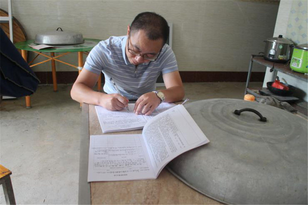 (圖為趙文博董事長與脫貧戶陳基東親切交流并填寫幫扶手冊)