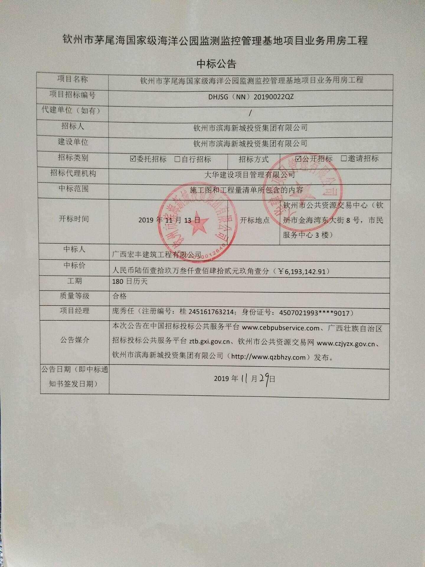 欽州市茅尾海國家級海洋公園監(jiān)測監(jiān)控管理基地項(xiàng)目業(yè)務(wù)用房工程-中標(biāo)公告