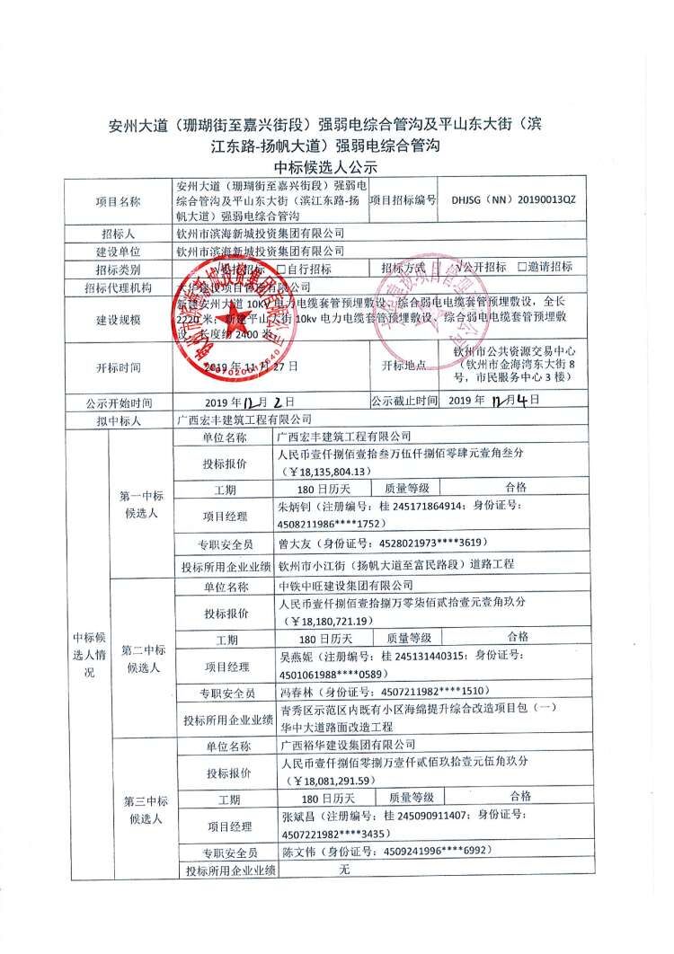 安州大道(珊瑚街至嘉興街段)強(qiáng)弱電綜合管溝及平山東大街(濱江東路-揚(yáng)帆大道)強(qiáng)弱電綜合管溝-中標(biāo)候選人公示