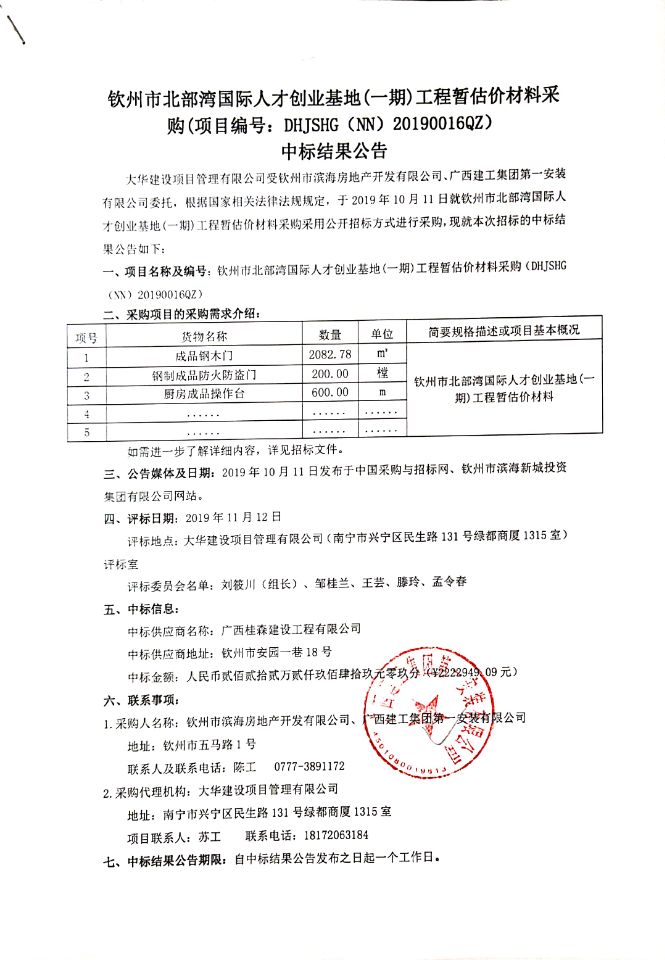 欽州市北部灣國際人才創(chuàng)業(yè)基地(一期)工程暫估價(jià)材料采購-中標(biāo)結(jié)果公告