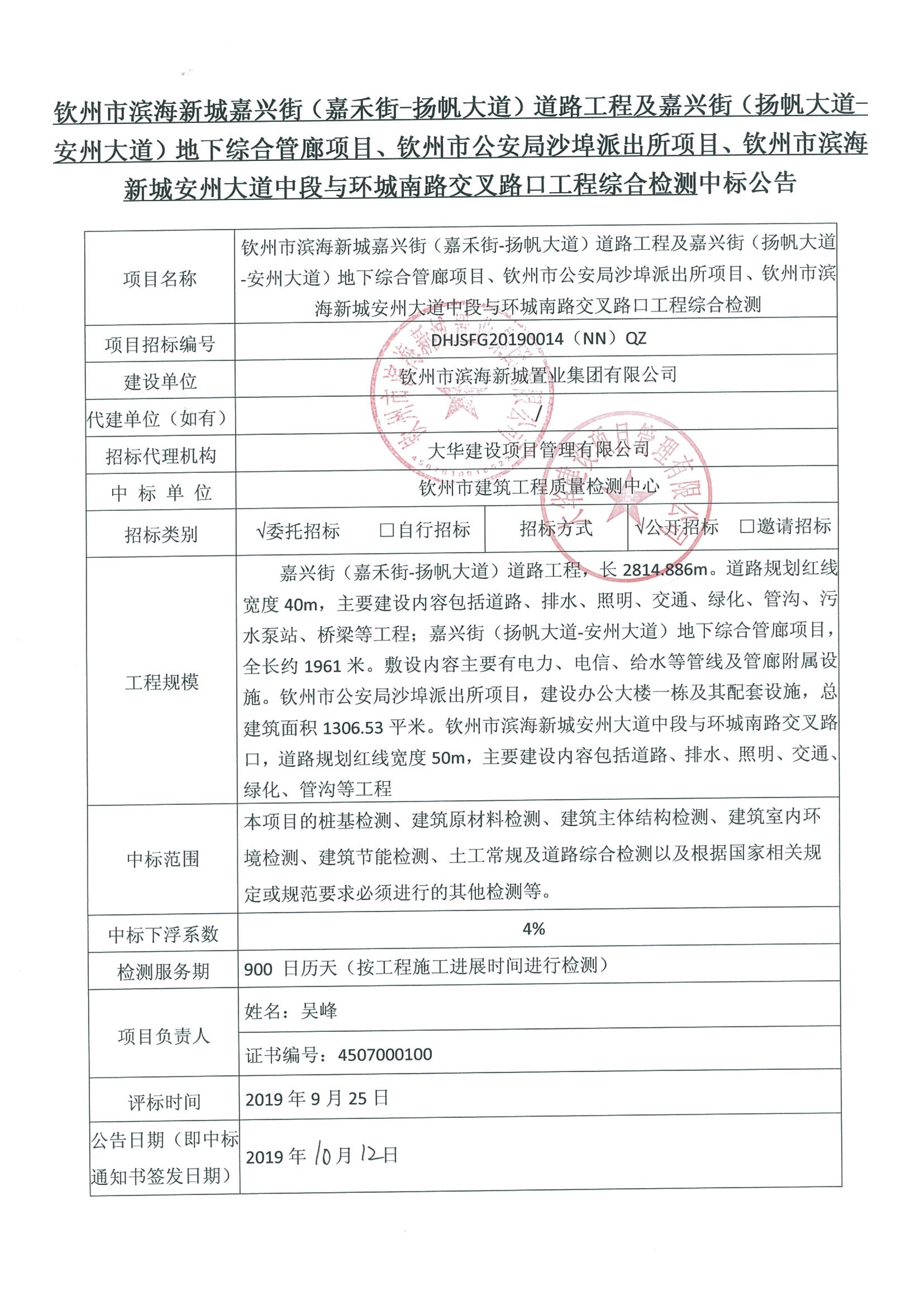 欽州市濱海新城嘉興街(嘉禾街-揚(yáng)帆大道)道路工程及嘉興街(揚(yáng)帆大道-安州大道)地下綜合管廊項(xiàng)目、欽州市公安局沙埠派出所項(xiàng)目、欽州市濱海新城安州大道中段與環(huán)城南路交叉路口工程綜合檢測中標(biāo)公告