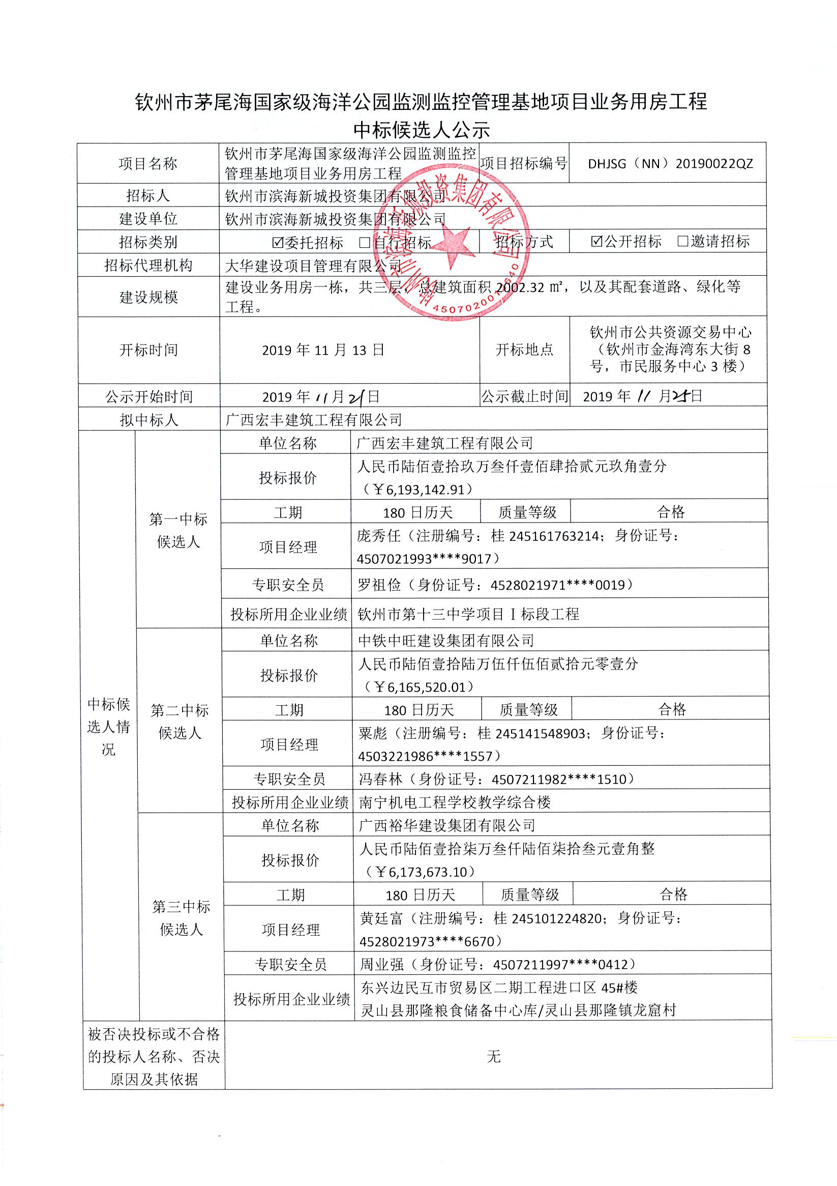 欽州市茅尾海國家級海洋公園監(jiān)測監(jiān)控管理基地項(xiàng)目業(yè)務(wù)用房工程中標(biāo)候選人公示
