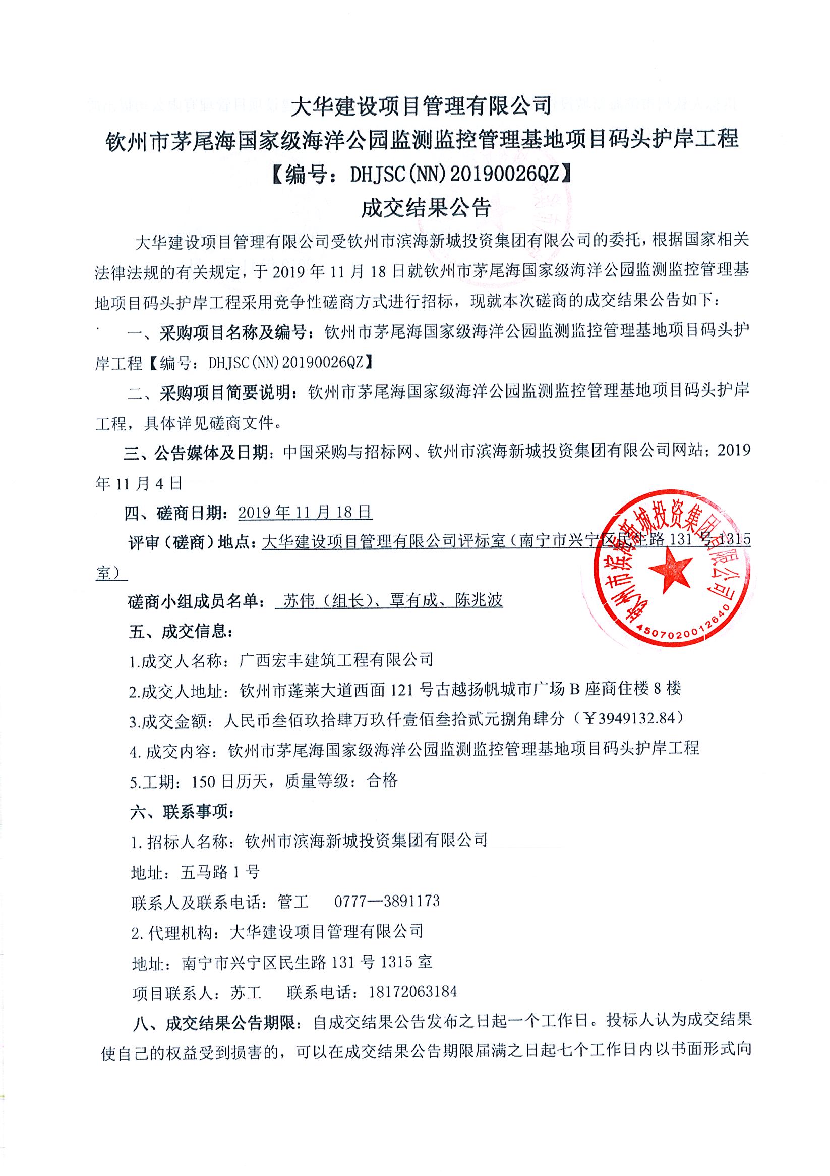 欽州市茅尾海國家級海洋公園監(jiān)測監(jiān)控管理基地項(xiàng)目碼頭護(hù)岸工程-成交結(jié)果公告