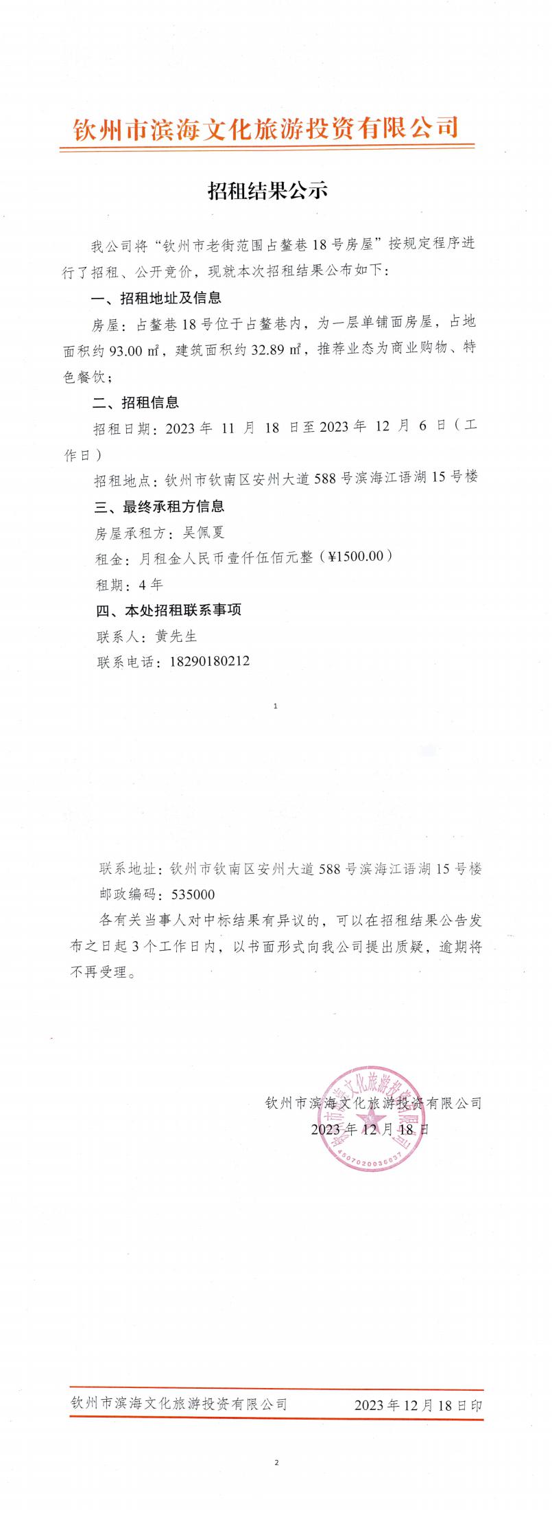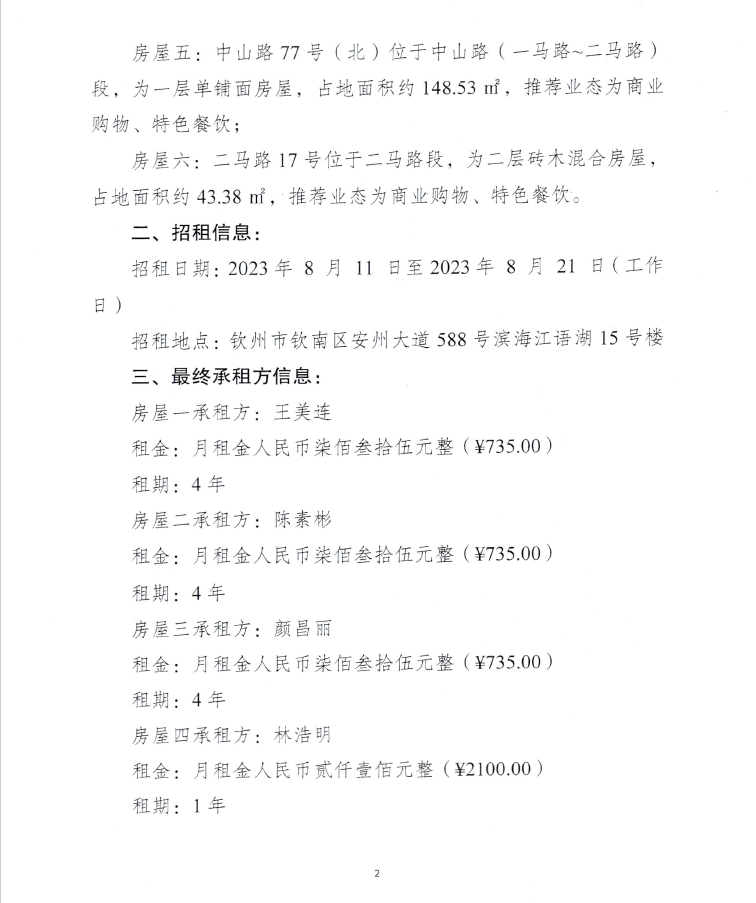 欽州市老街范圍占鰲巷67、71號兩處房屋公開招租結果公示