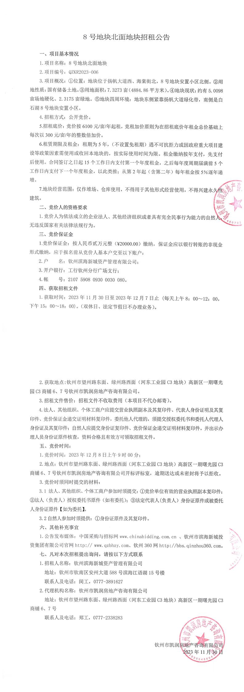8號地塊北面地塊(QZKR2023-006)成交結果公告
