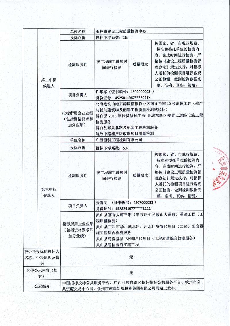 欽州市濱海新城茶山江大街項(xiàng)目、安州大道(珊瑚街至嘉興街段)強(qiáng)弱電綜合管溝及平山東大街(濱江東路-揚(yáng)帆大道)強(qiáng)弱電綜合管溝項(xiàng)目綜合檢測(cè)中標(biāo)候選人公示