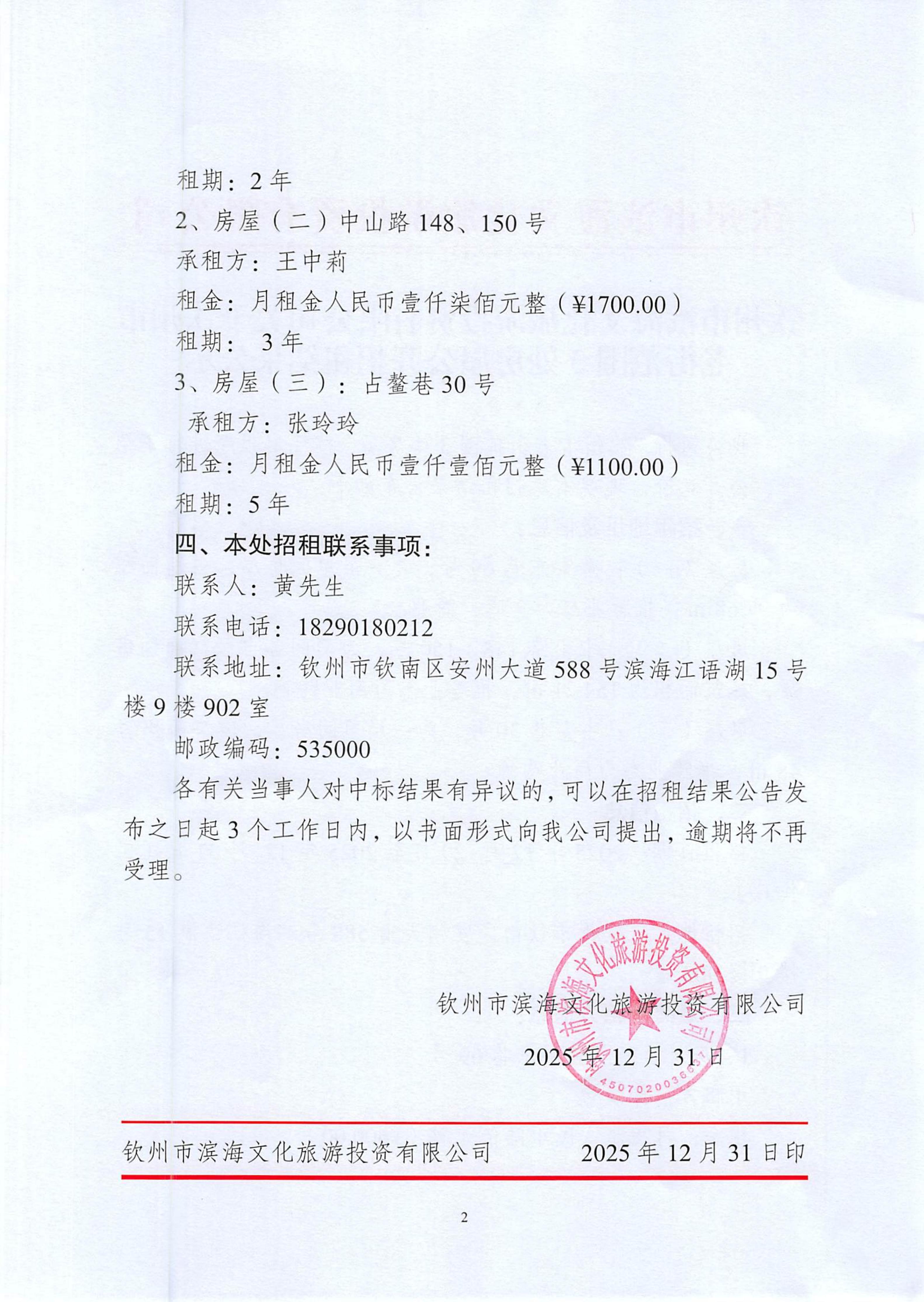 欽州市濱海文化旅游投資有限公司關(guān)于欽州市老街范圍3處房屋公開招租結(jié)果公示