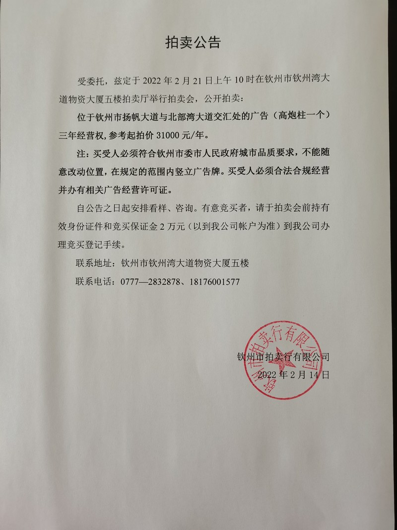 拍賣公告(揚(yáng)帆大道與北部灣大道交匯處廣告經(jīng)營(yíng)權(quán))