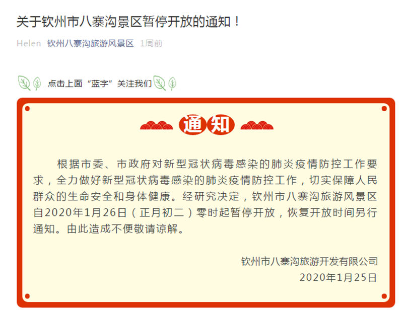 為進(jìn)一步加強(qiáng)八寨溝景區(qū)新型冠狀病毒感染的肺炎疫情防控工作,有效防止疫情經(jīng)旅游途徑傳播,切實保障游客及公司員工身體健康和生命安全。根據(jù)欽州市委專題擴(kuò)大會議對新型冠狀病毒感染肺炎疫情防控工作的部署,欽州市文化廣電體育和旅游局《關(guān)于取消欽州市 2020 年春節(jié)期間文化體育旅游活動和暫停相關(guān)文化體育旅游業(yè)務(wù)的通知》,以及欽州市文化廣電體育和旅游局《關(guān)于全市A級景區(qū)、鄉(xiāng)村旅游區(qū)、農(nóng)家樂暫停對外開放的通知》,...