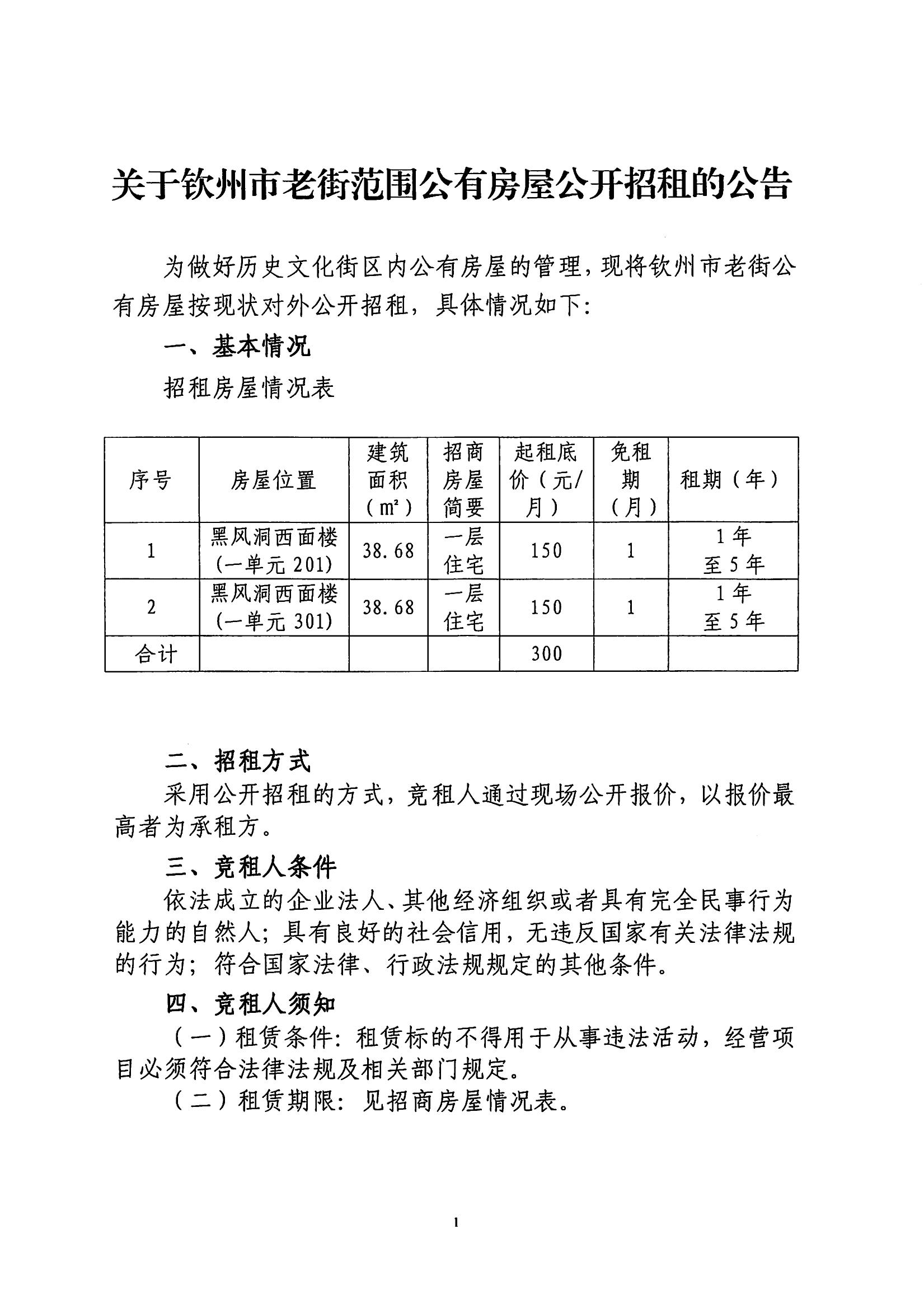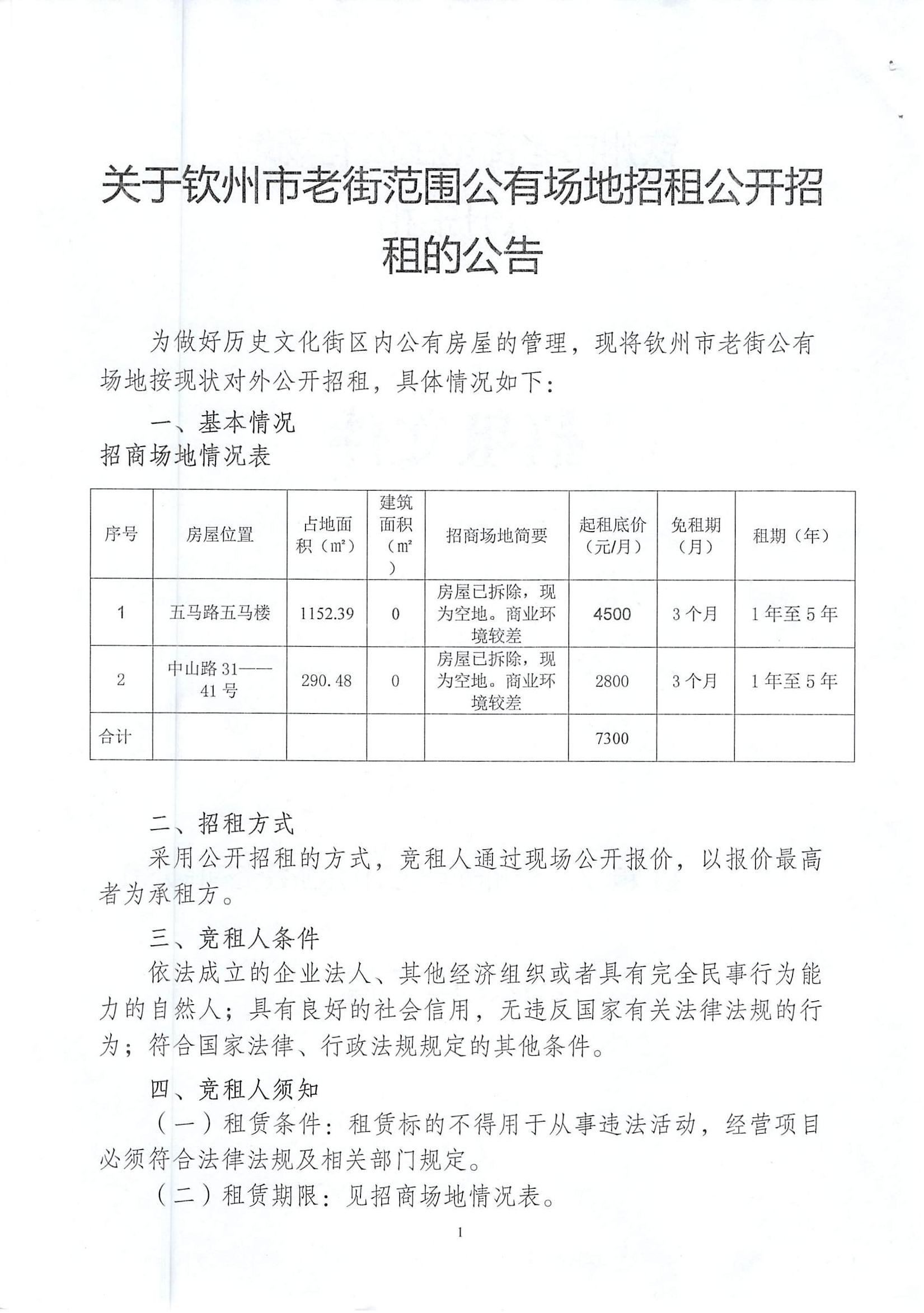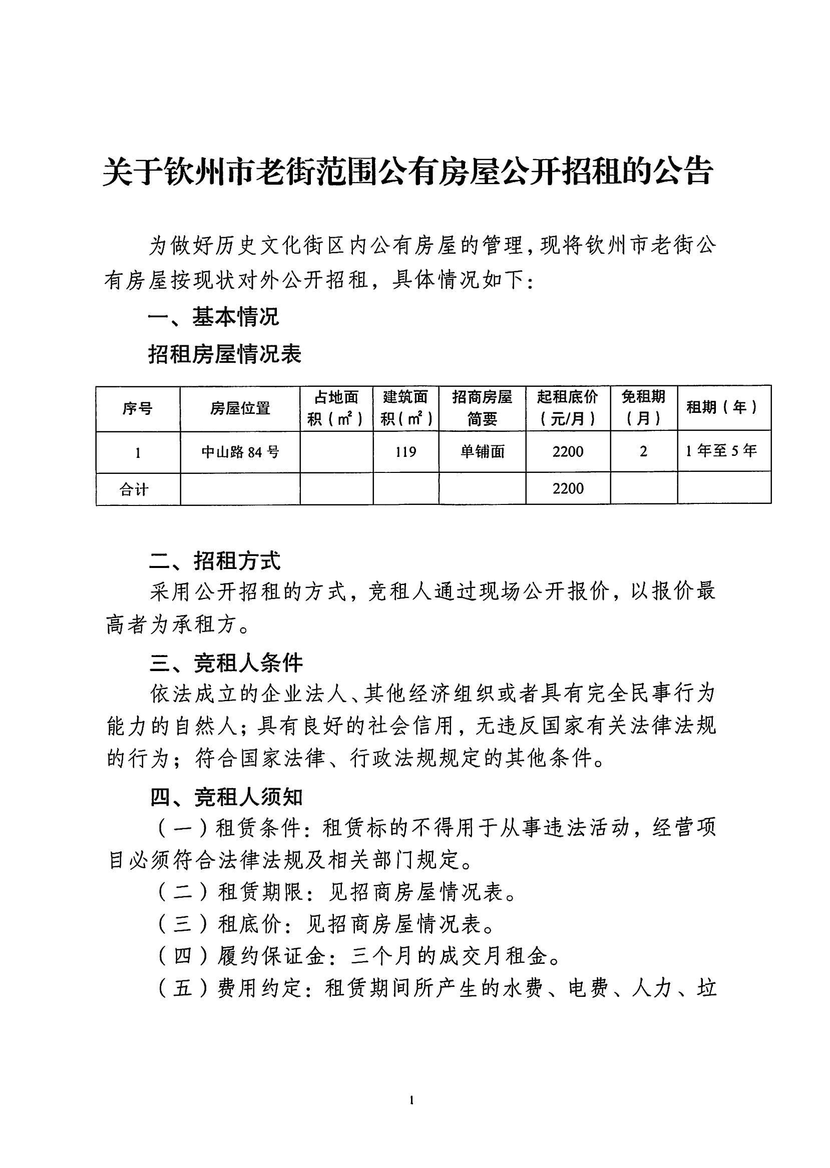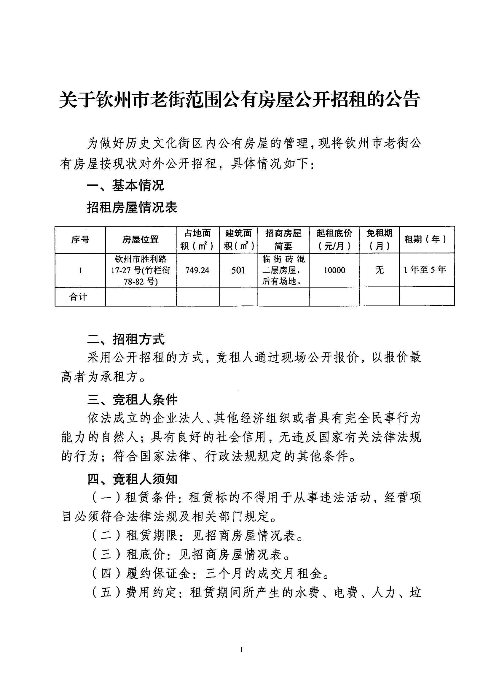 關(guān)于欽州市老街范圍公有房屋(場地)招租公開招租的公告