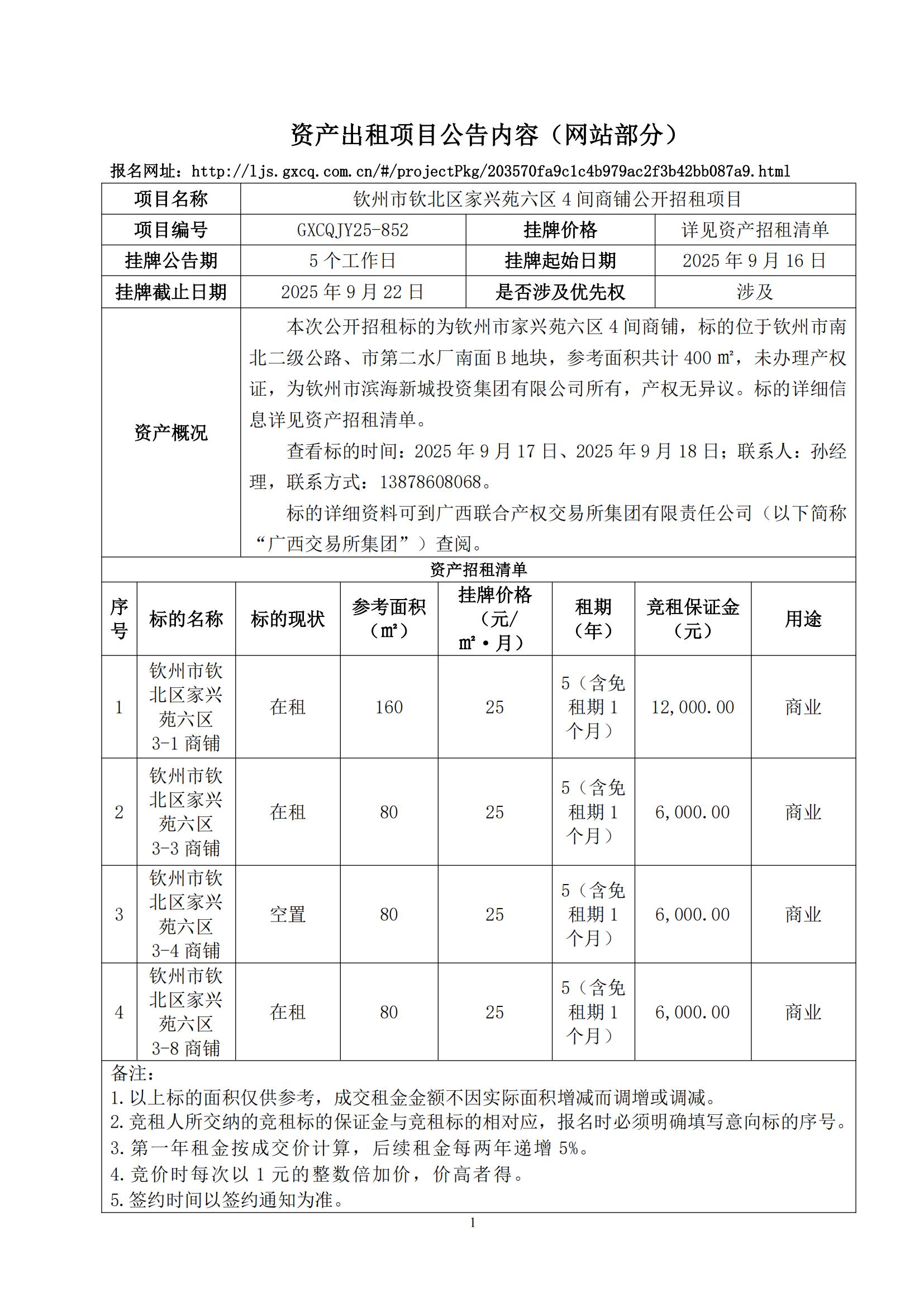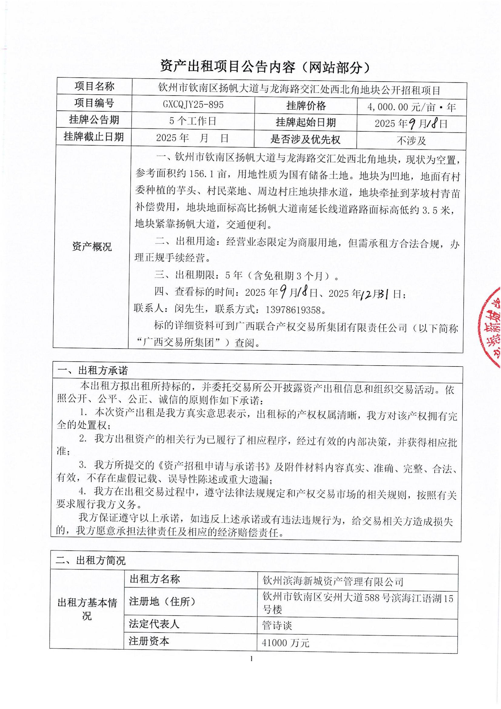 欽州濱海新城資產(chǎn)管理有限公司旺鋪及地塊對外招租公告