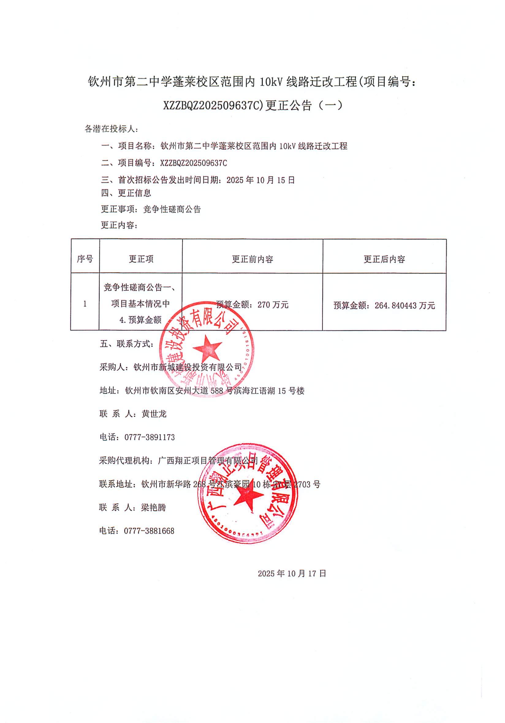 欽州市第二中學(xué)蓬萊校區(qū)范圍內(nèi)10kV線路遷改工程(項(xiàng)目編號: XZZBQZ202509637C)更正公告(一)