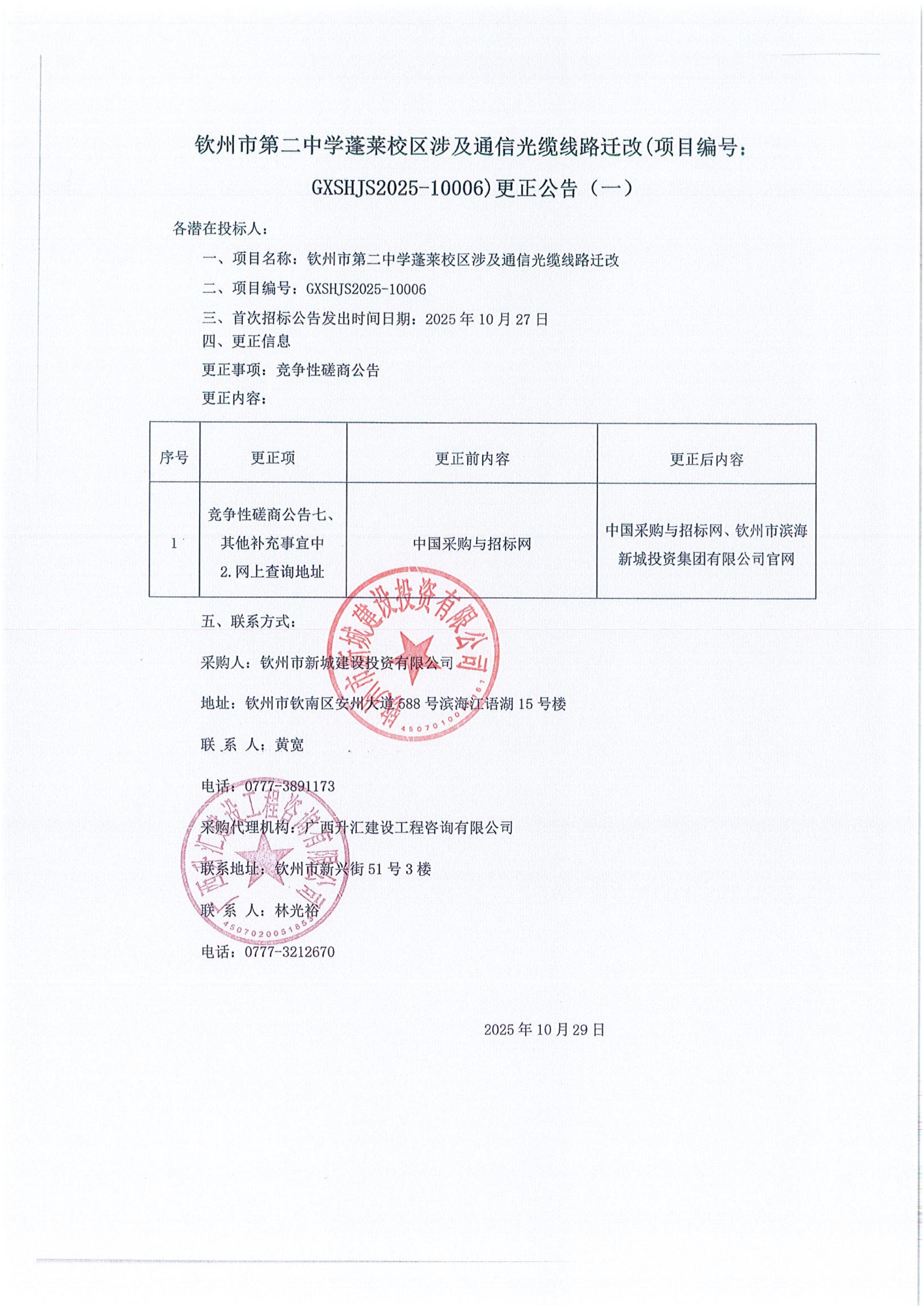 欽州市第二中學(xué)蓬萊校區(qū)涉及通信光纜線路遷改(項(xiàng)目編號: GXSHJS2025-10006)更正公告(一)