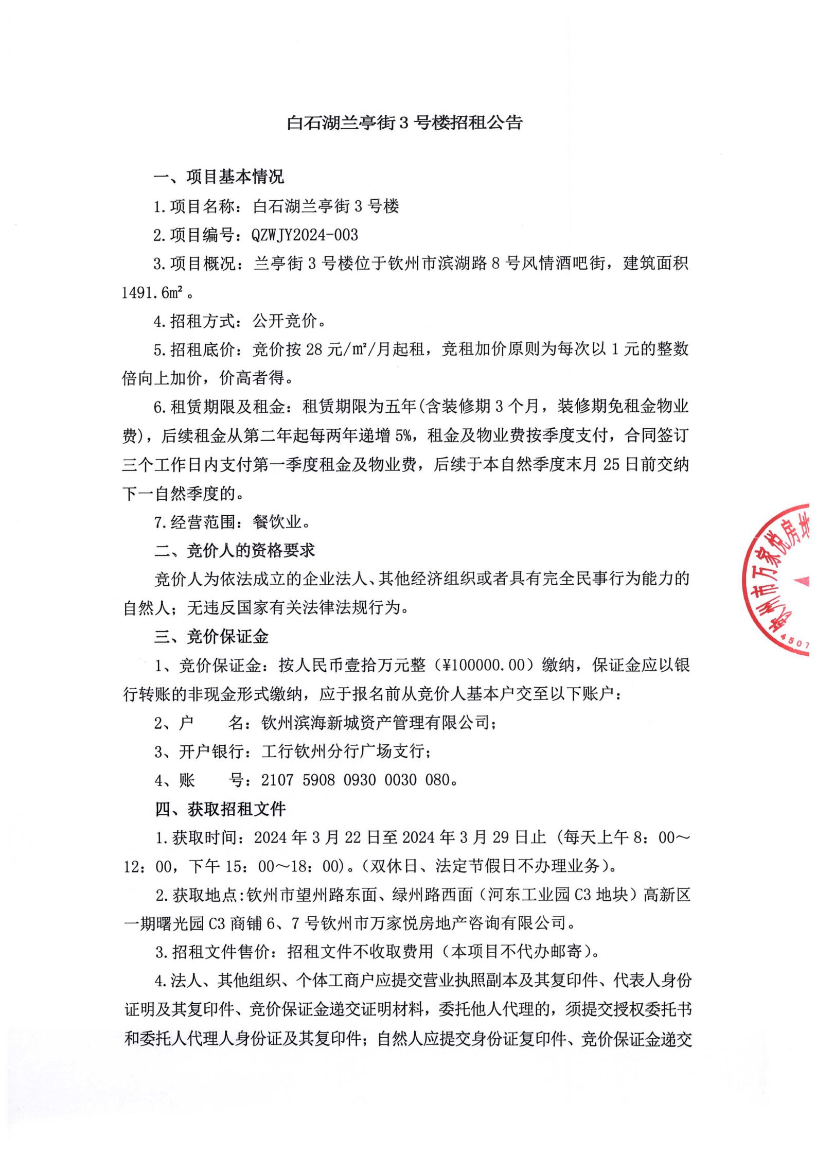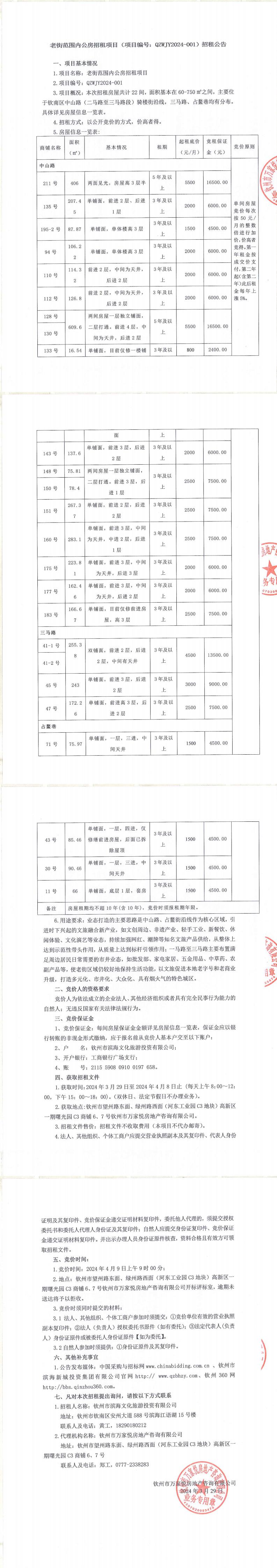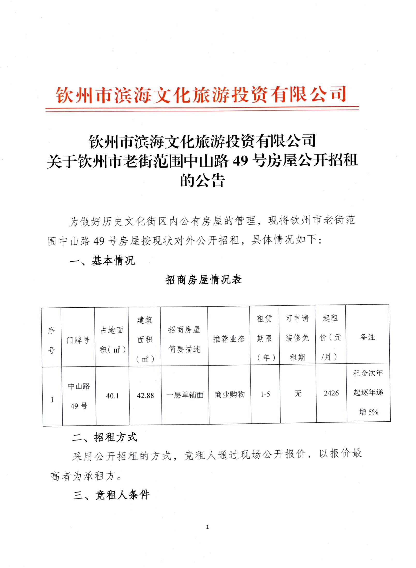 關(guān)于欽州市老街范圍中山路49號房屋公開招租的公告