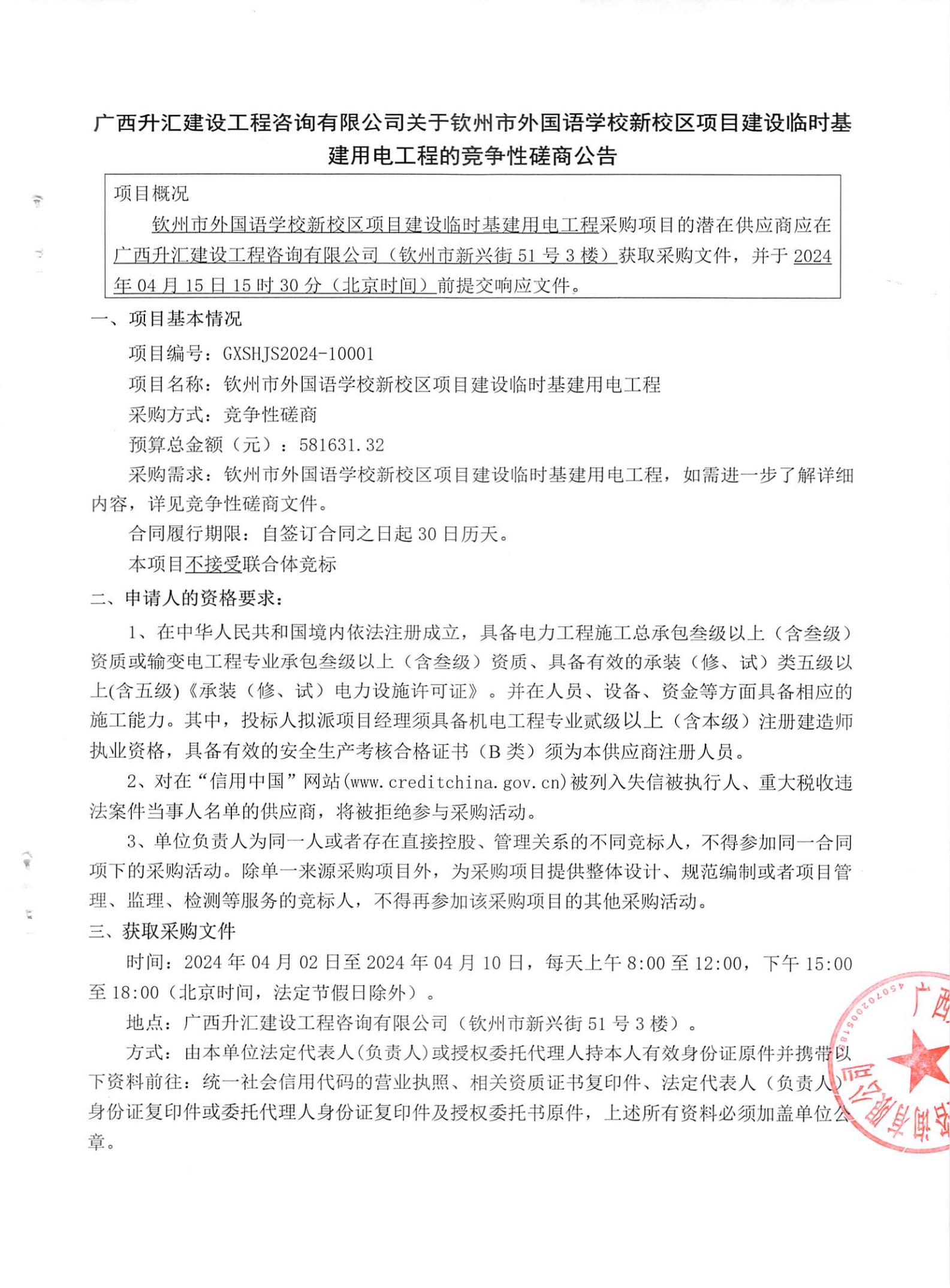 廣西升匯建設(shè)工程咨詢有限公司關(guān)于欽州市外國語學(xué)校新校區(qū)項目建設(shè)臨時基建用電工程的競爭性磋商公告