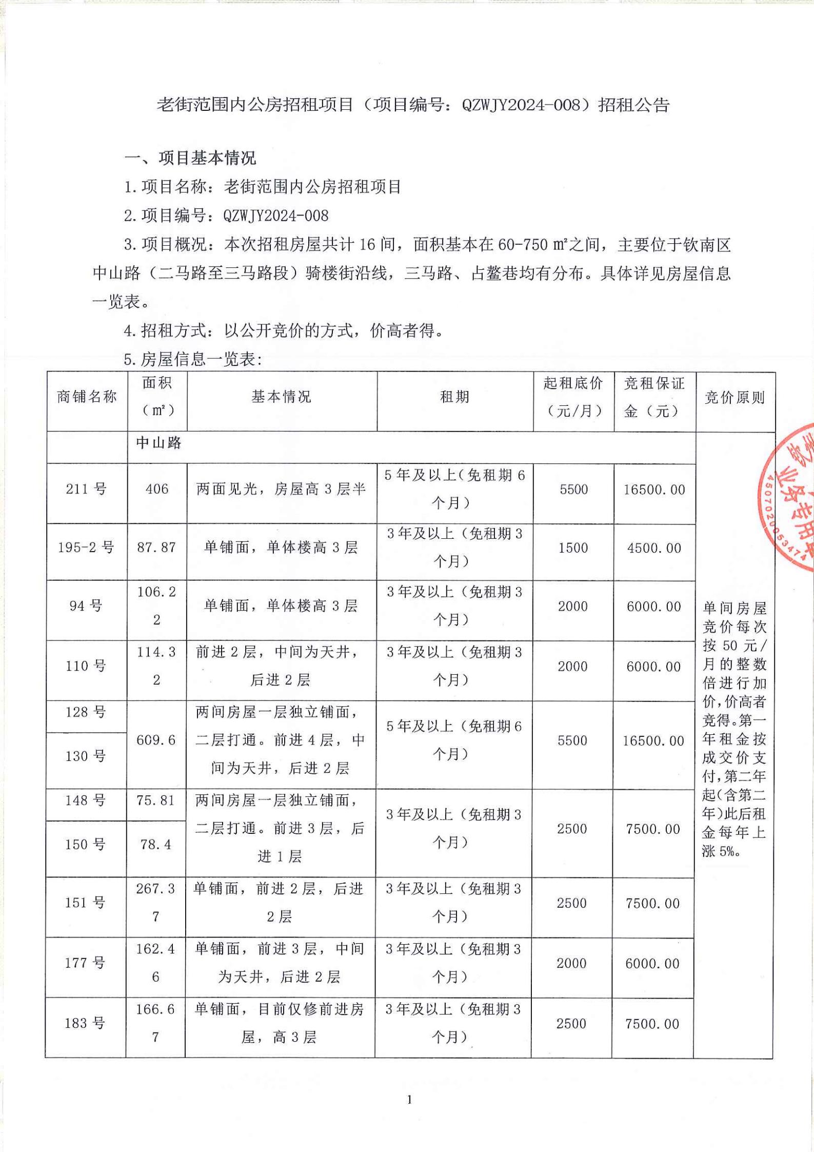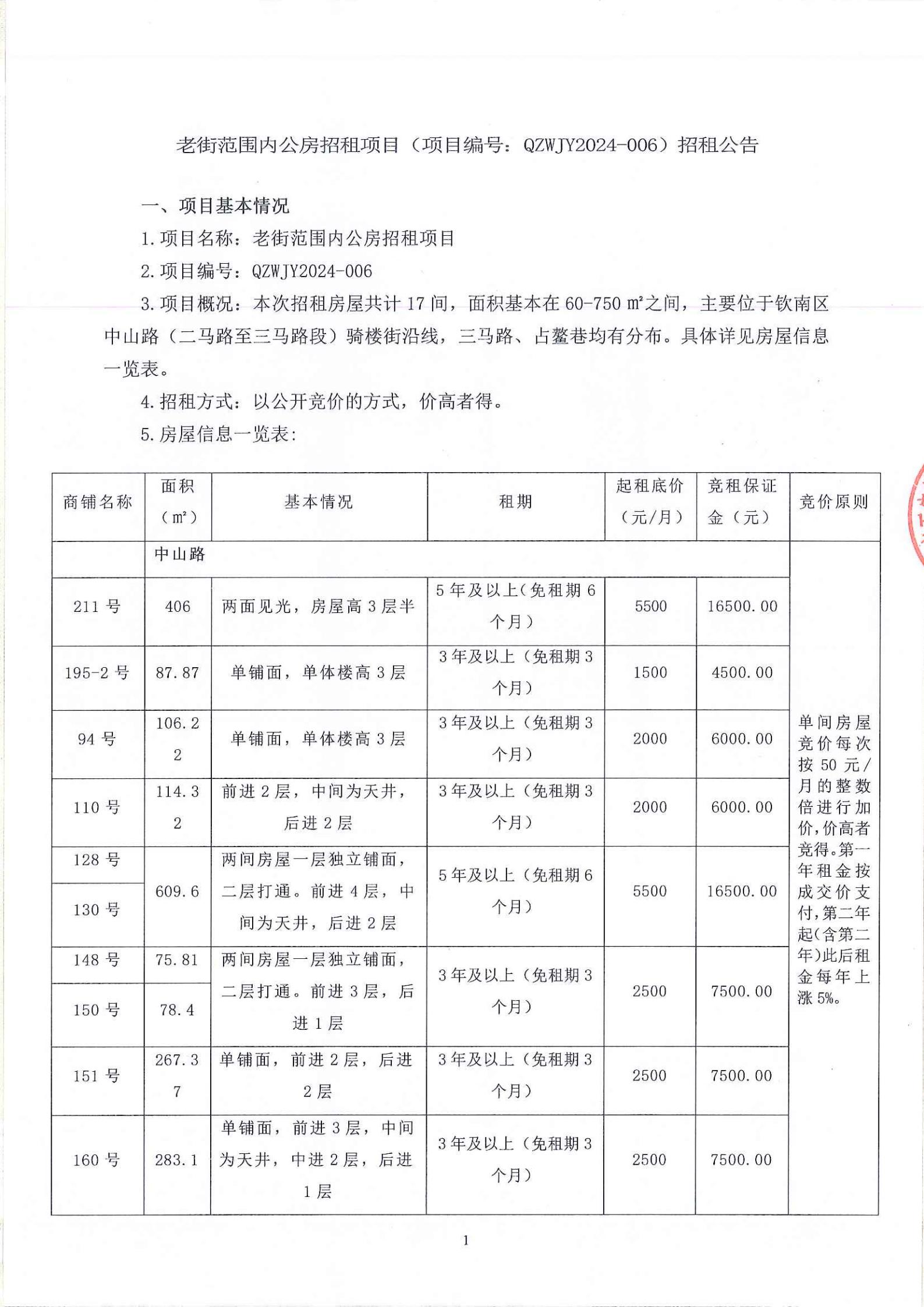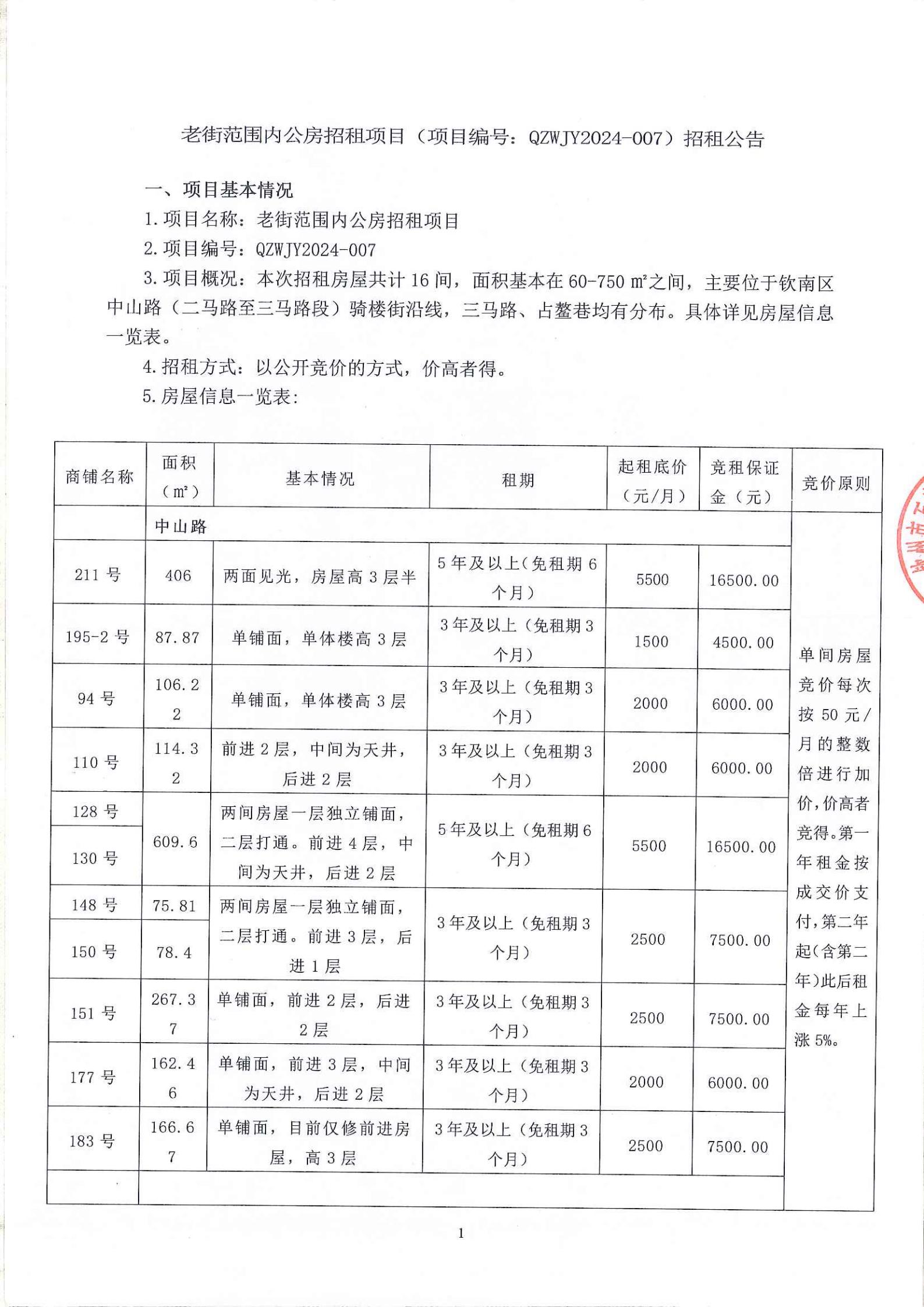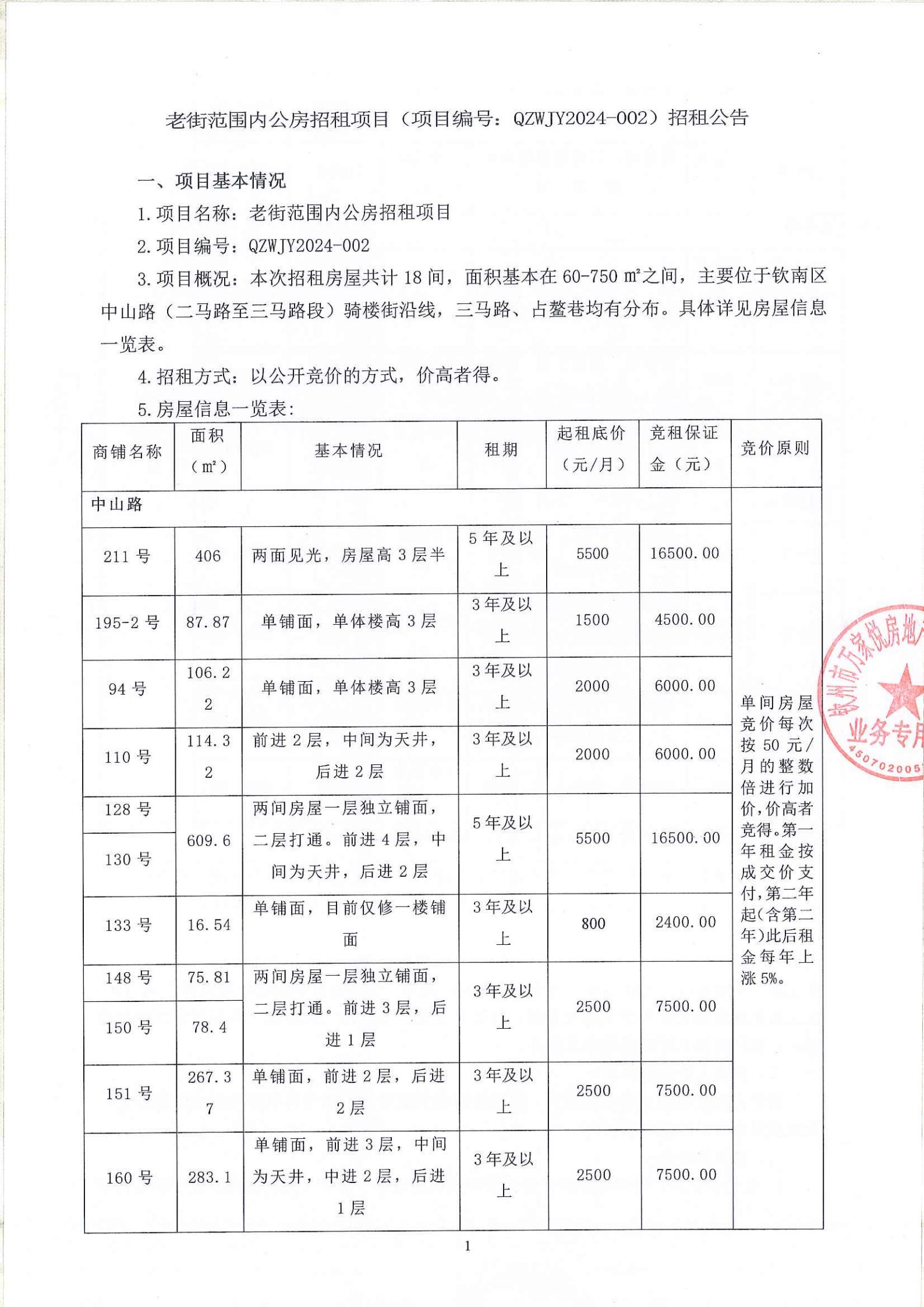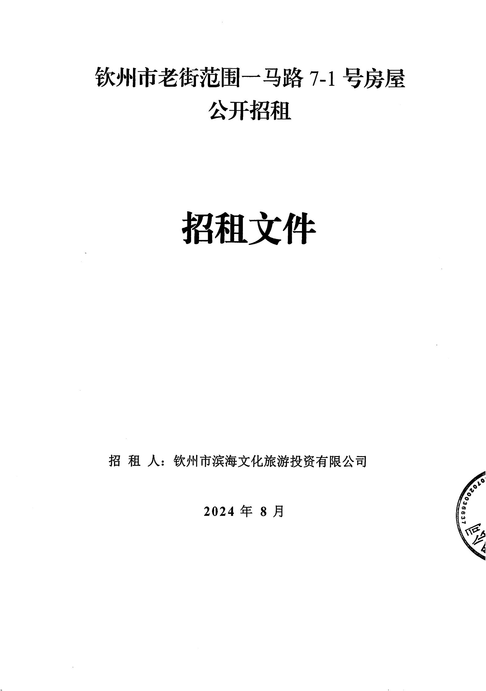 欽州市老街范圍一馬路7-1號房屋公開招租招租文件