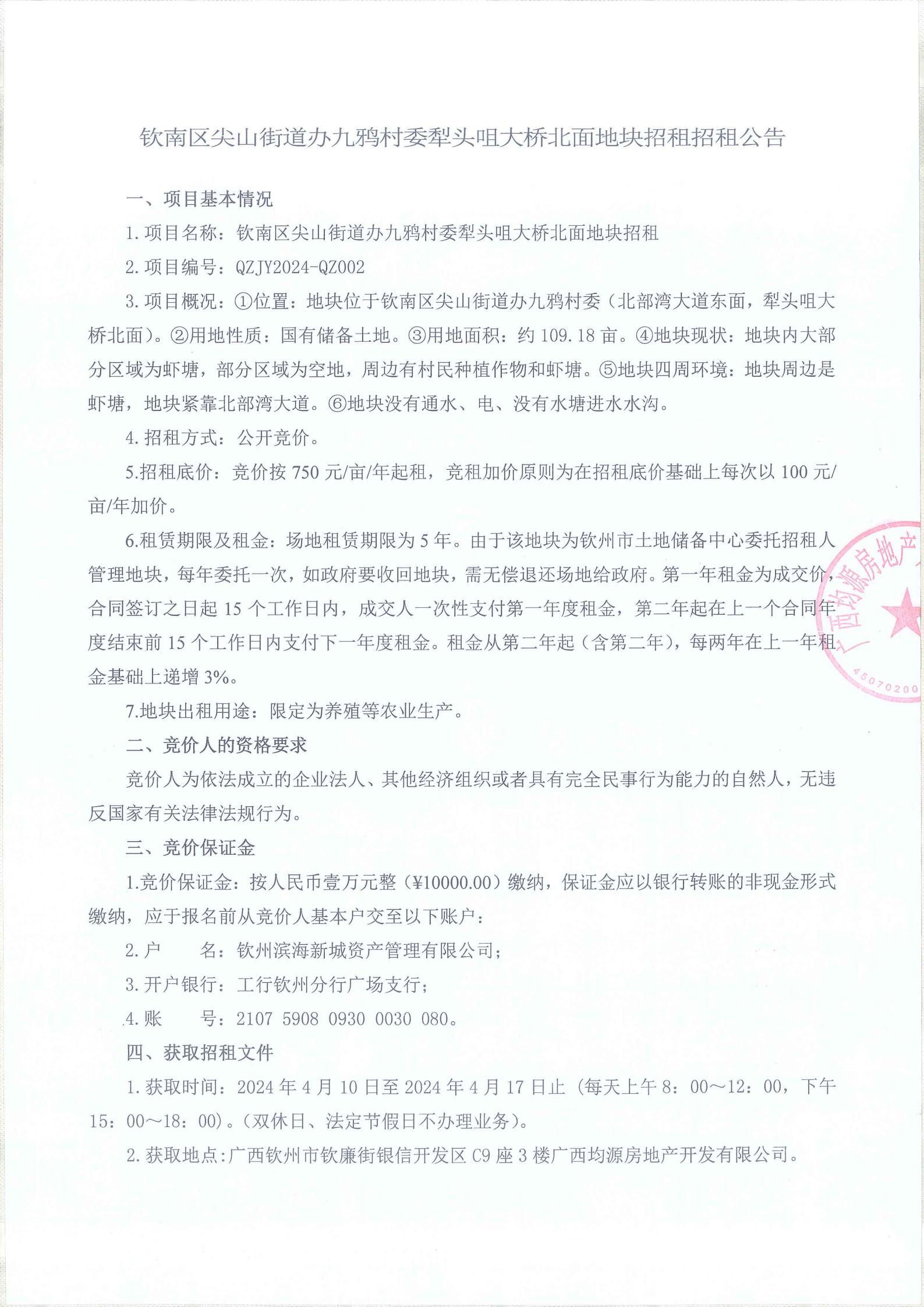 欽南區(qū)尖山街道辦九鴉村委犁頭咀大橋北面地塊招租