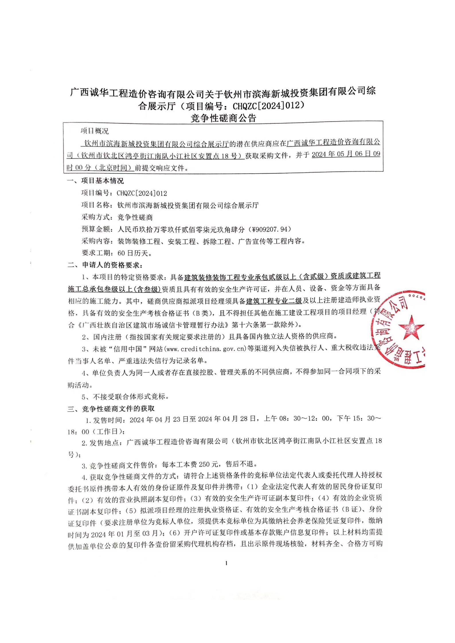 欽州市濱海新城投資集團(tuán)有限公司綜合展示廳競爭性磋商公告
