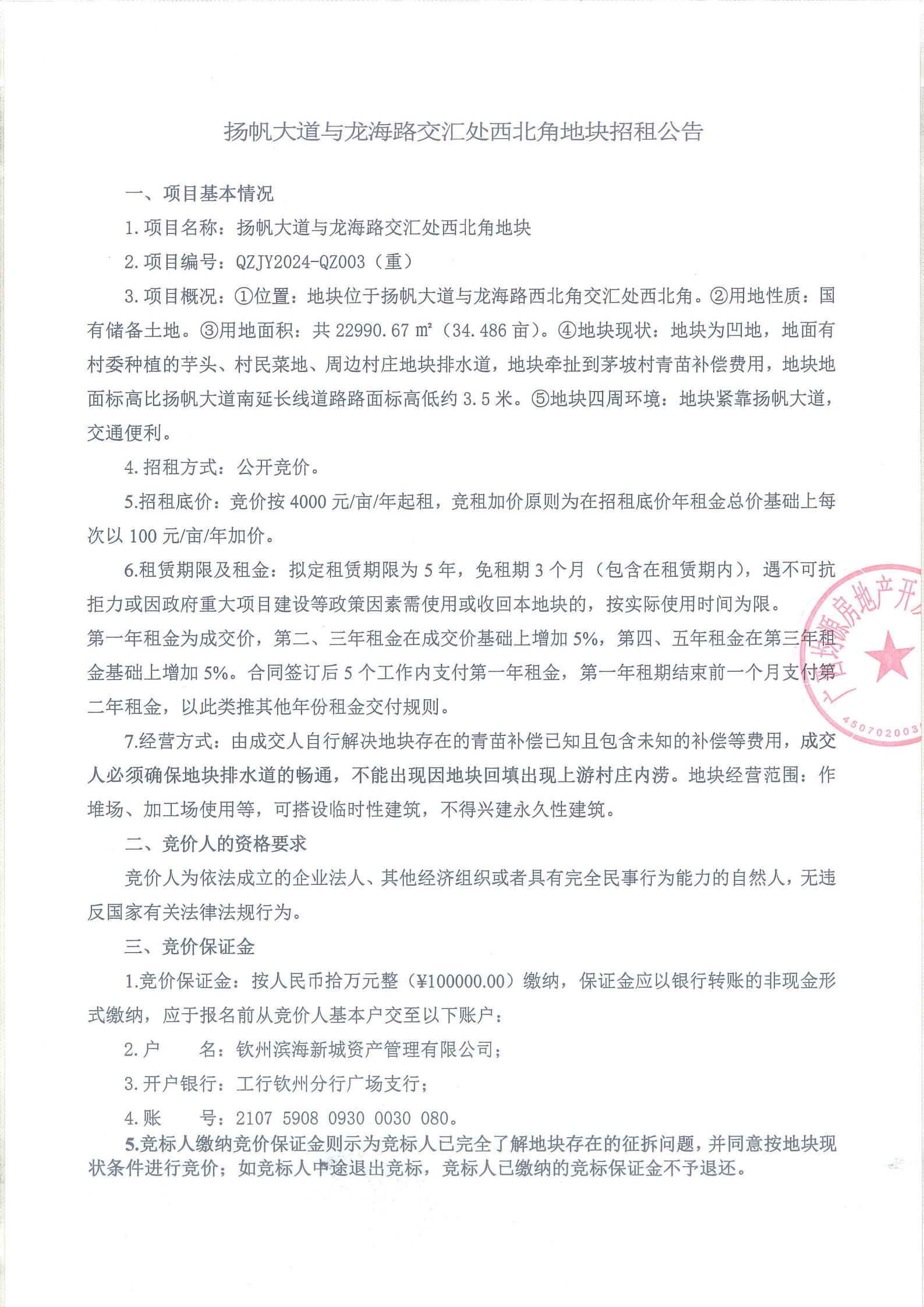 揚(yáng)帆大道與龍海路交匯處西北角地塊招租公告