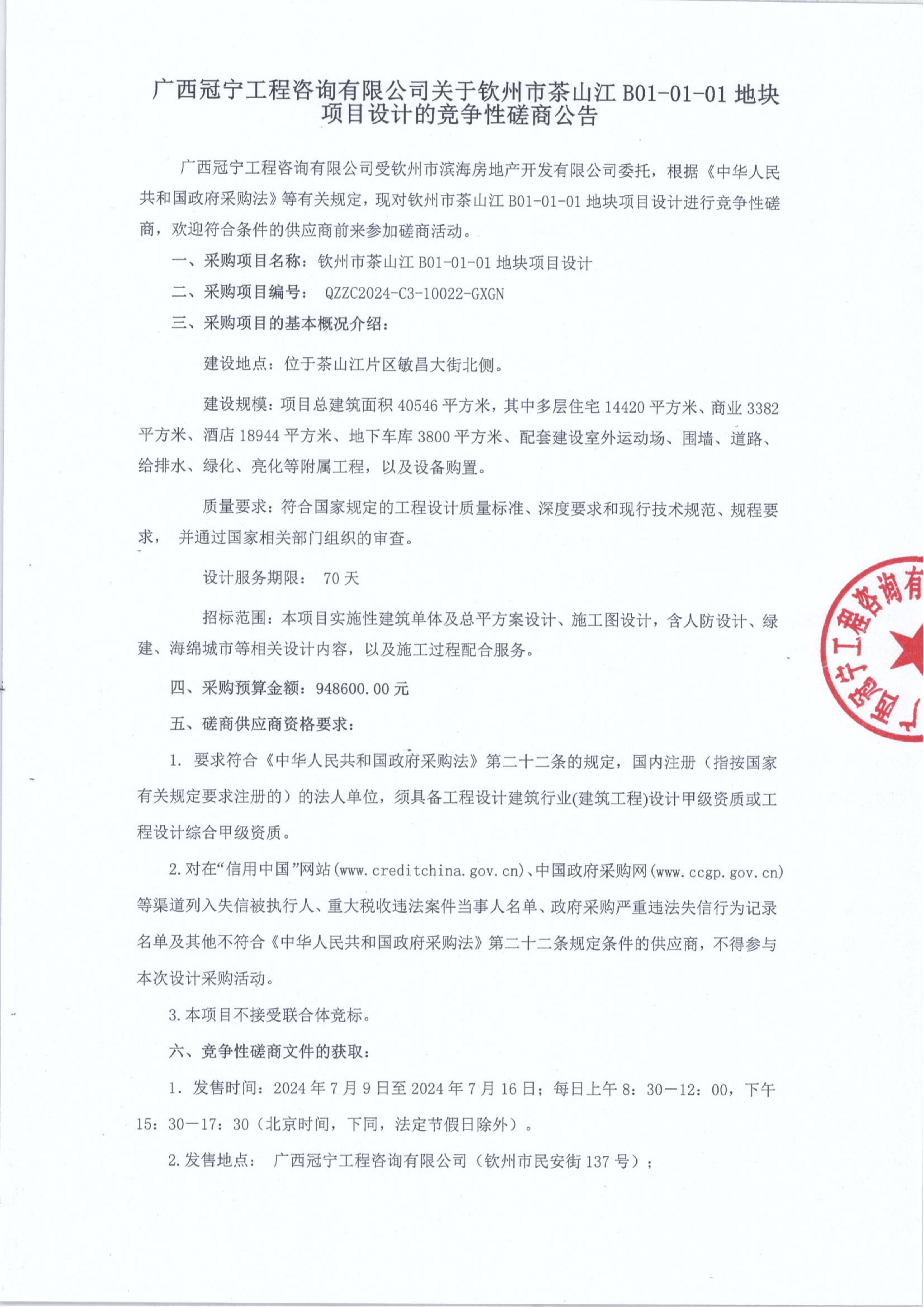 廣西冠寧工程咨詢有限公司關(guān)于欽州市茶山江B01-01-01地塊項目設(shè)計的競爭性磋商公告