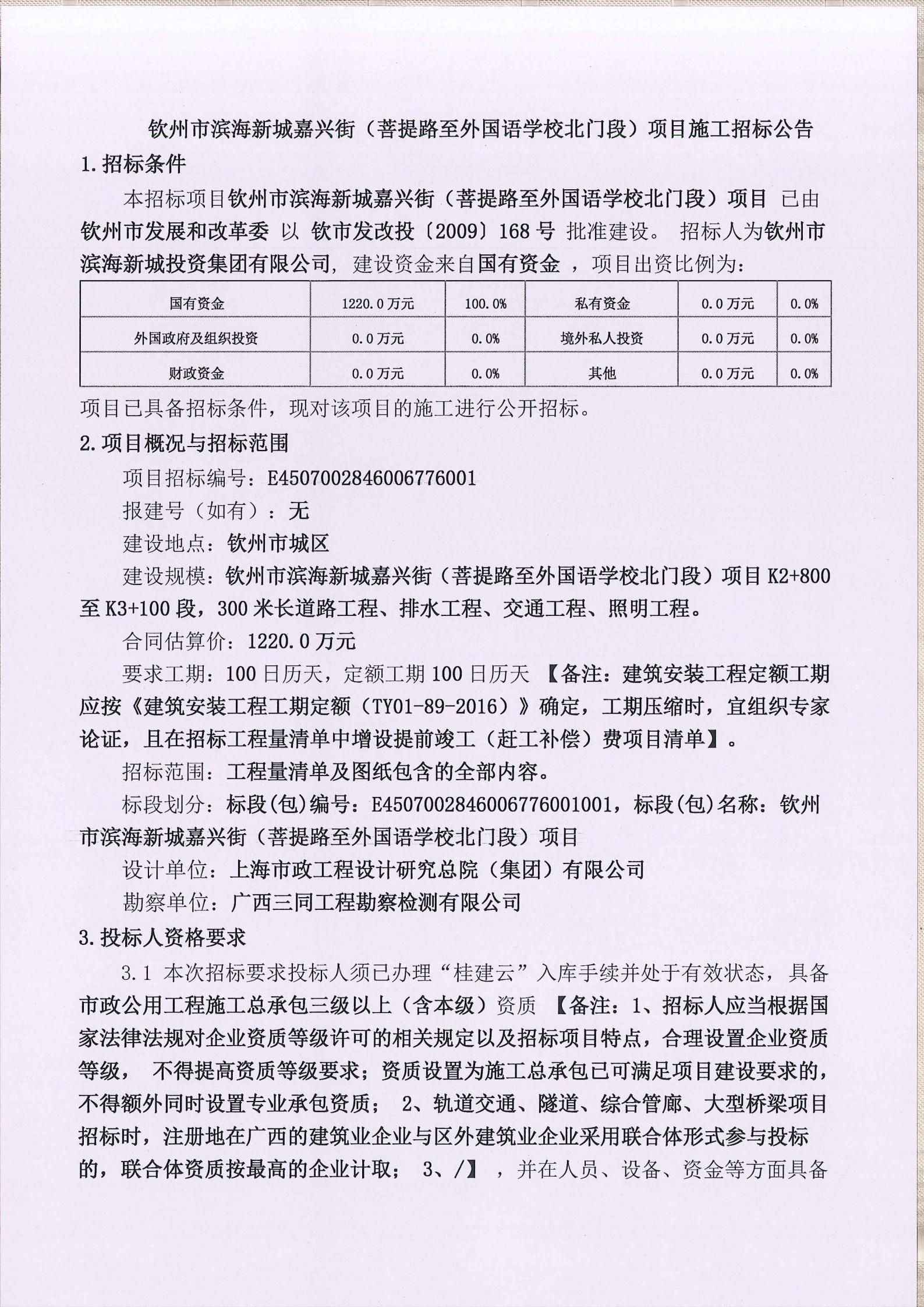 欽州市濱海新城嘉興街(菩提路至外國語學(xué)校北門段)項目施工招標(biāo)公告