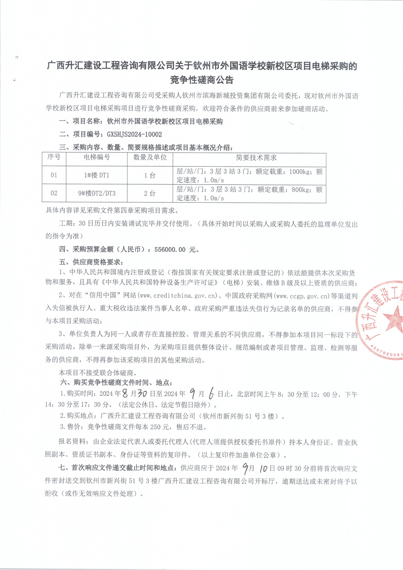廣西升匯建設(shè)工程咨詢有限公司關(guān)于欽州市外國語學(xué)校新校區(qū)項目電梯采購的競爭性磋商公告