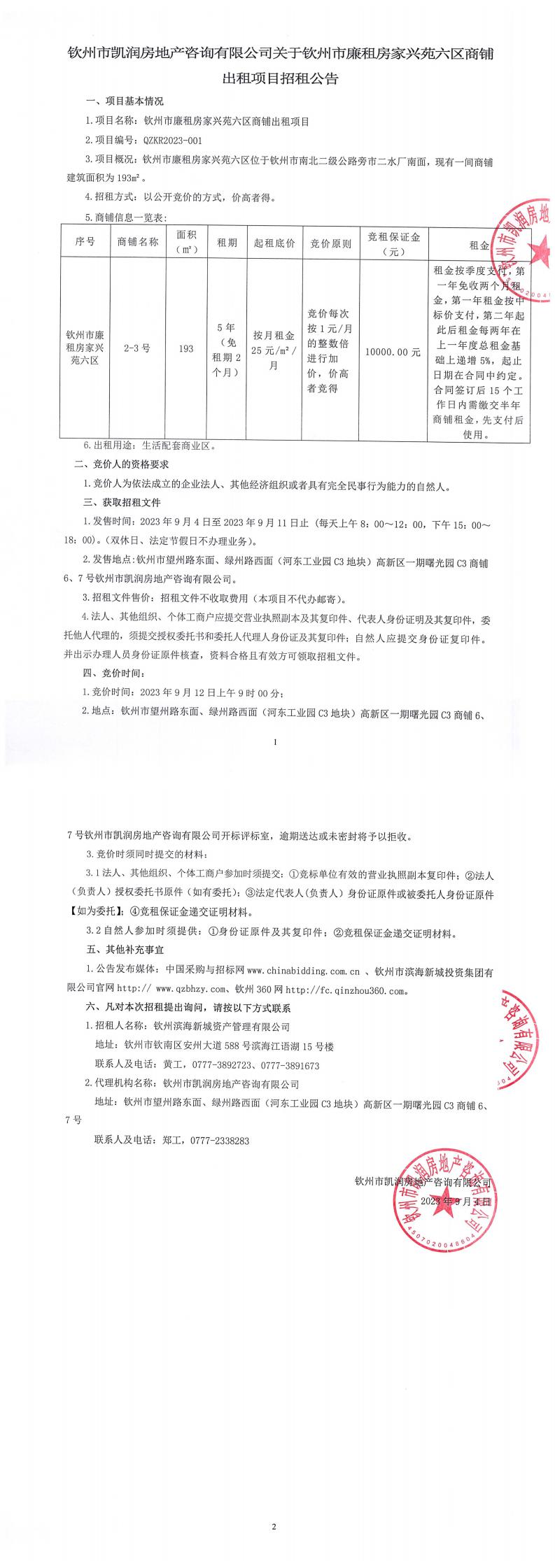 欽州市廉租房家興苑六區(qū)商鋪出租項目招租公告