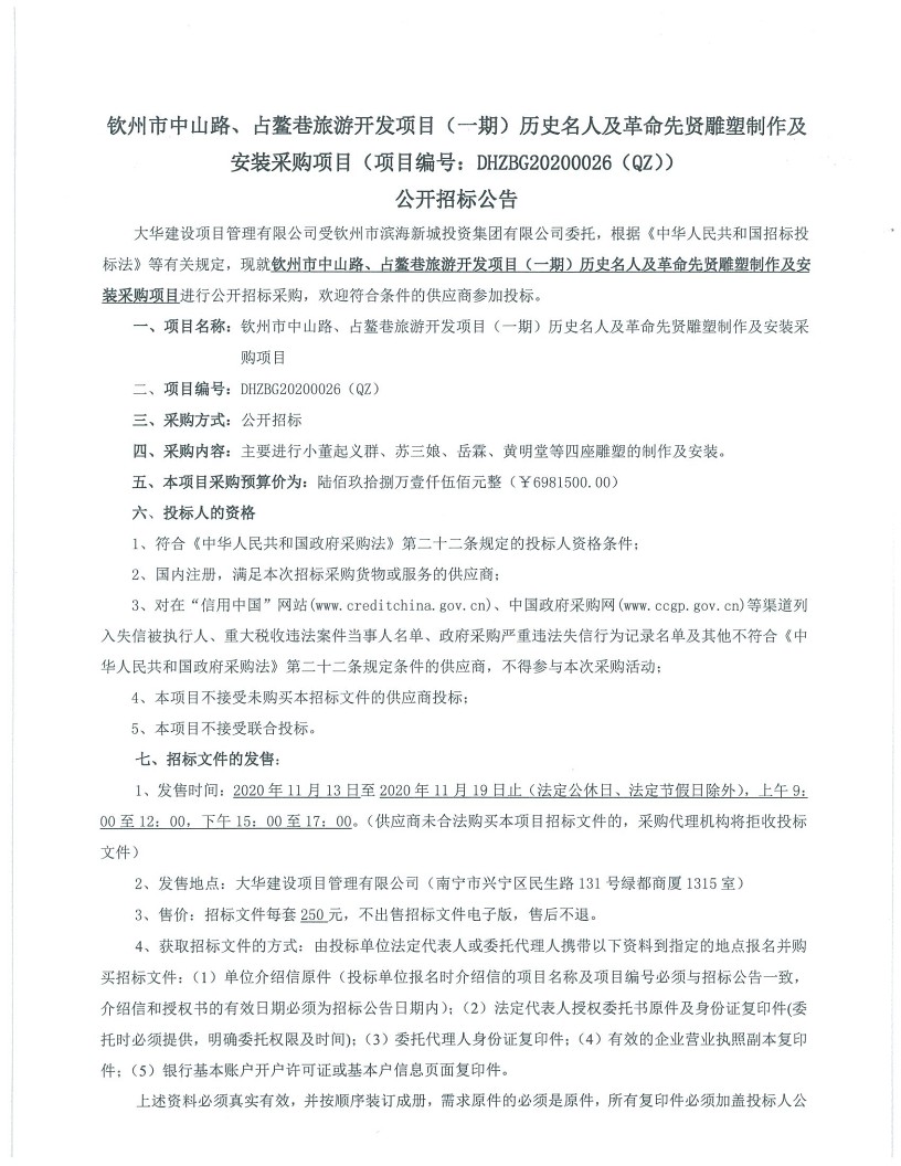 欽州市中山路、占鰲巷旅游開發(fā)項目(一期)歷史名人及革命先賢雕塑制作及安裝采購項目公開招標(biāo)公告