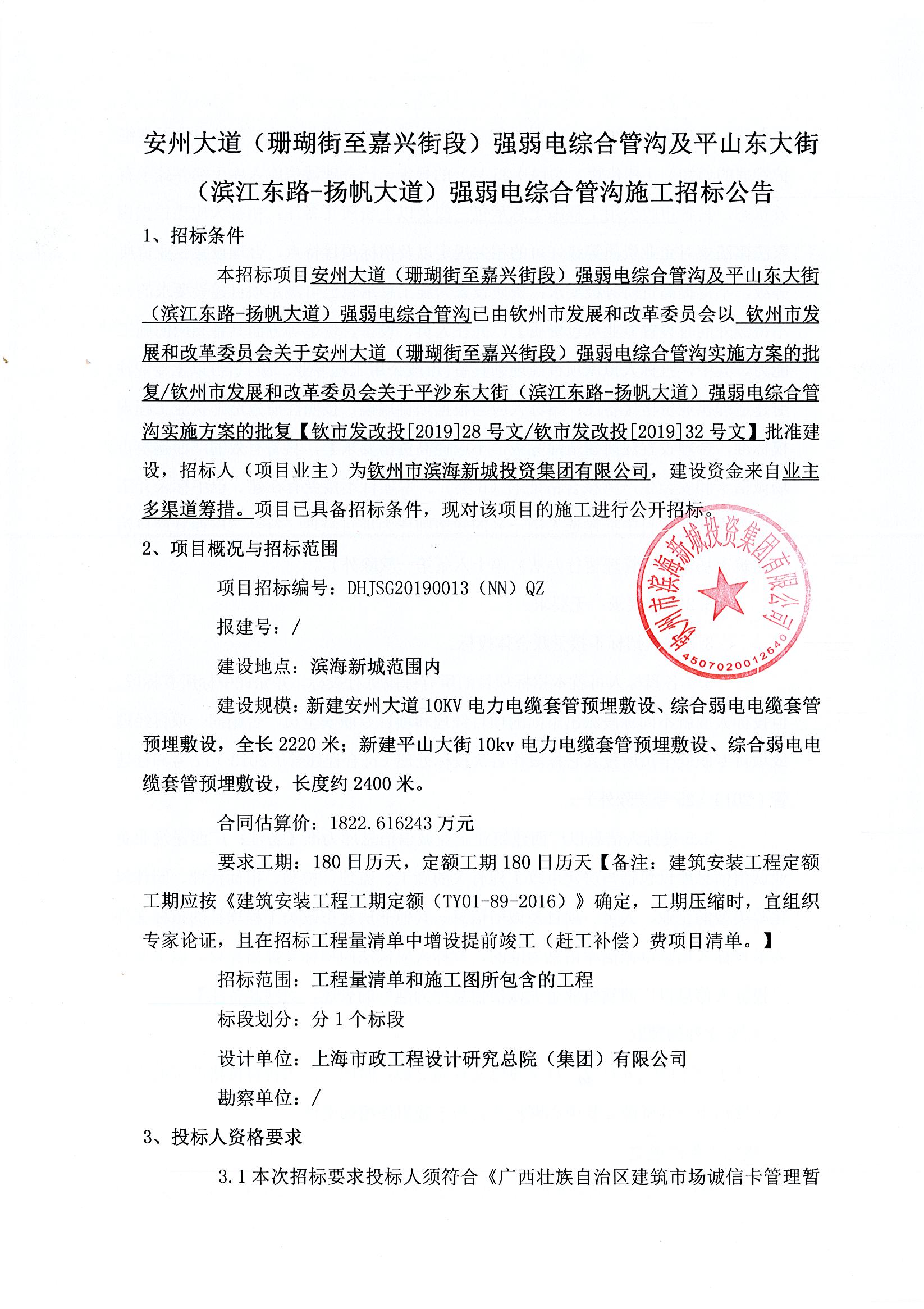 欽州市濱海新城茶山江大街項目、安州大道(珊瑚街至嘉興街段)強(qiáng)弱電綜合管溝及平山東大街(濱江東路-揚(yáng)帆大道)強(qiáng)弱電綜合管溝項目綜合檢測招標(biāo)公告