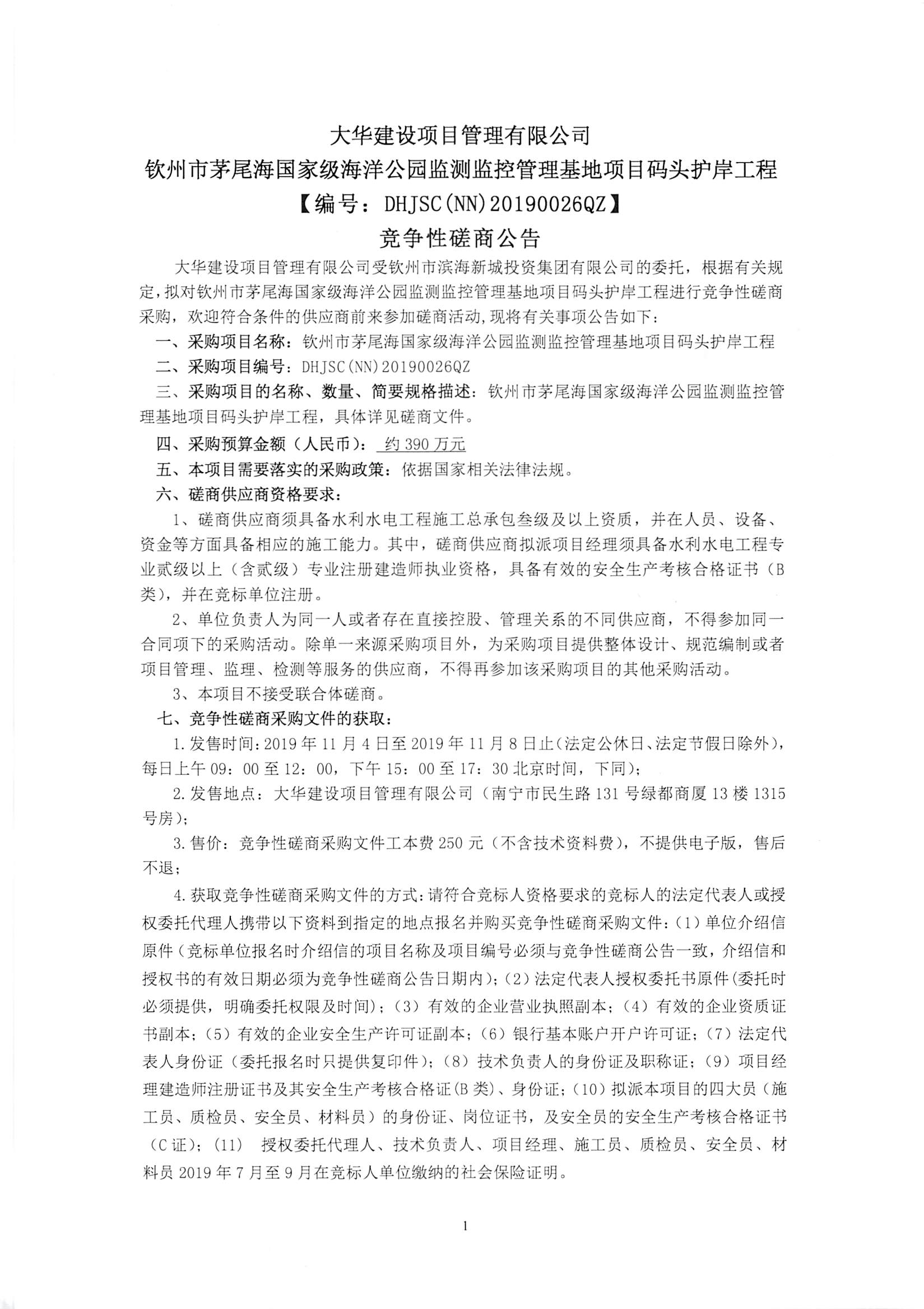 競爭性磋商公告--欽州市茅尾海國家級海洋公園監(jiān)測監(jiān)控管理基地項目碼頭護(hù)岸工程