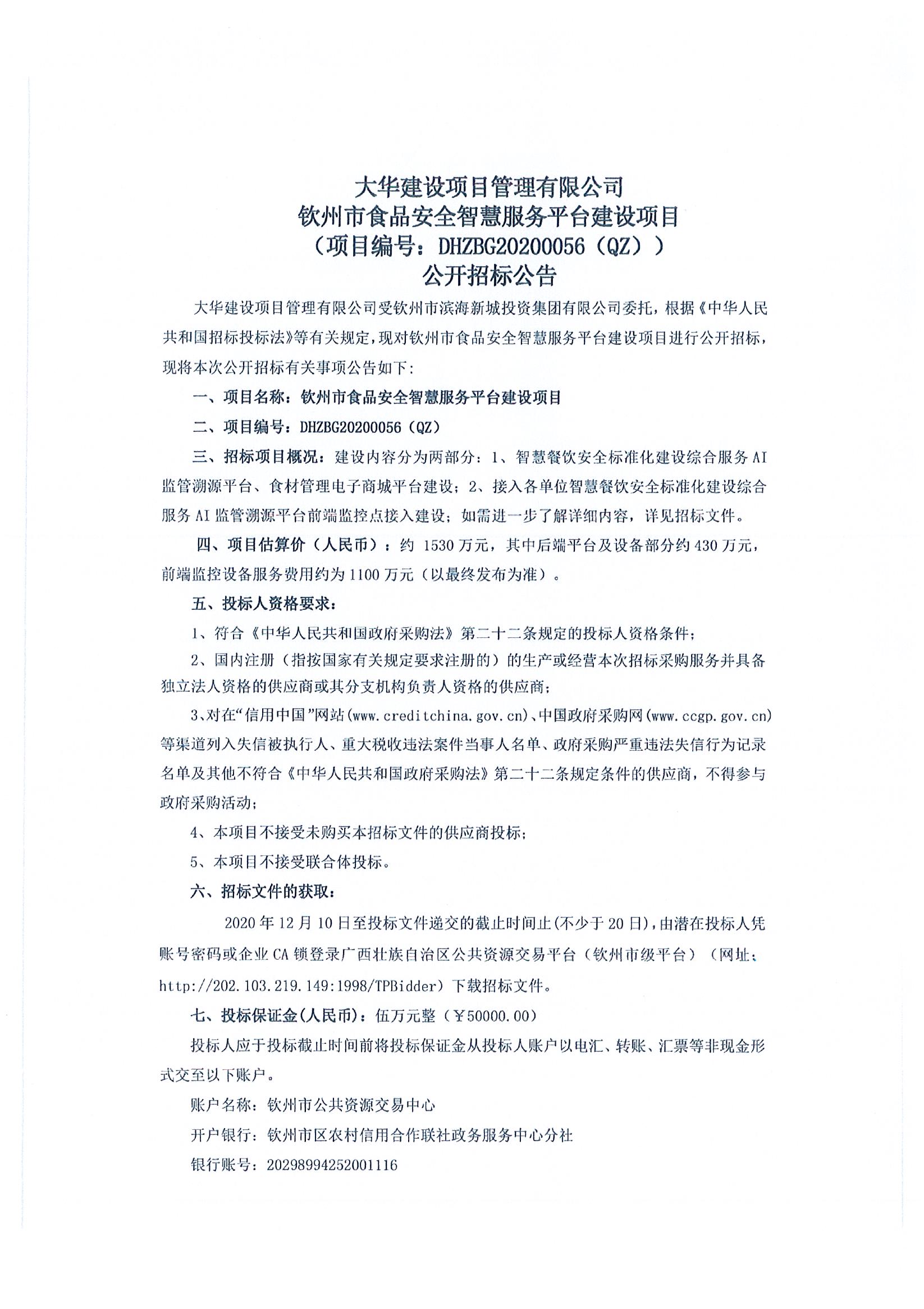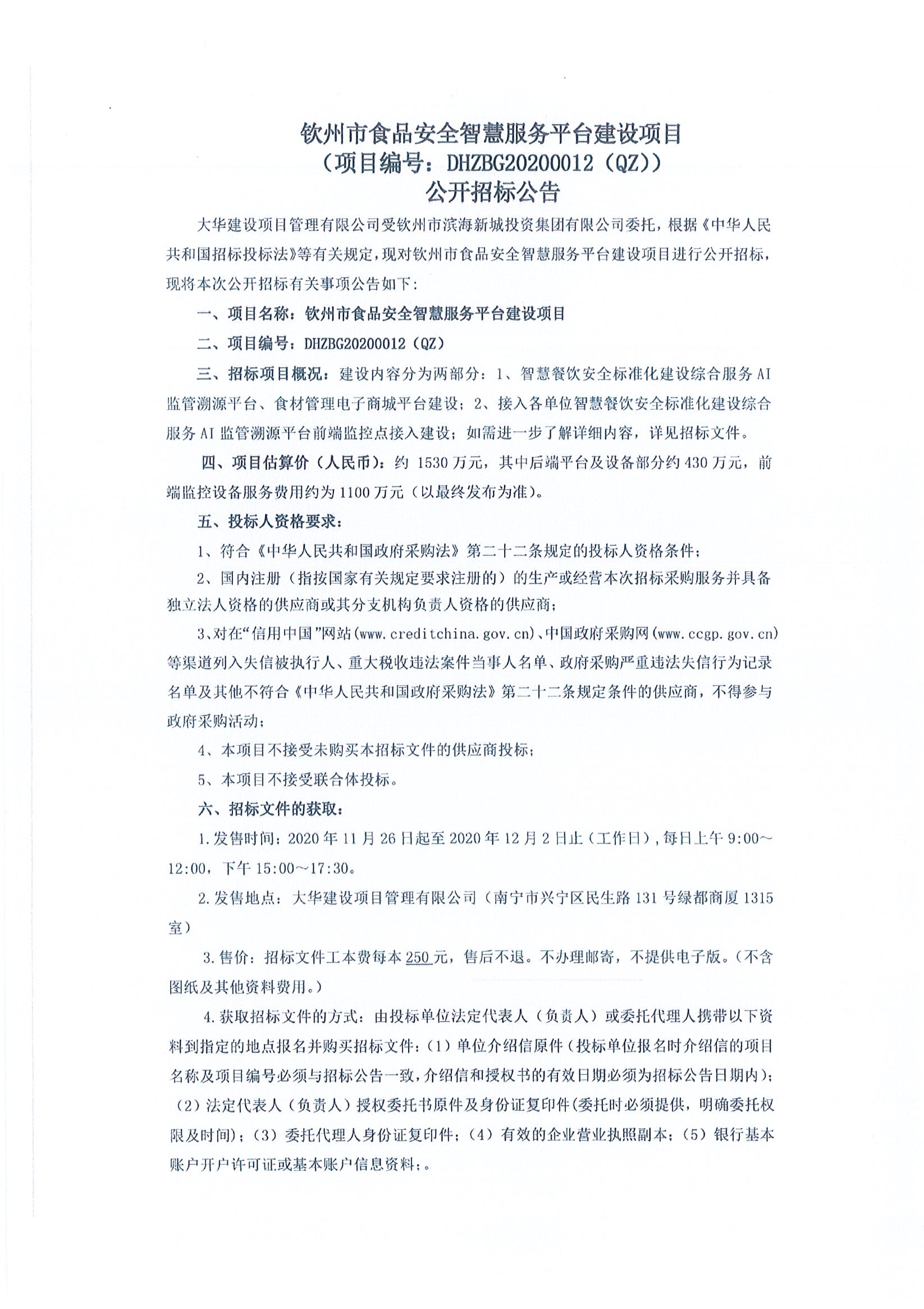 欽州市食品安全智慧服務(wù)平臺建設(shè)項目公開招標(biāo)公告