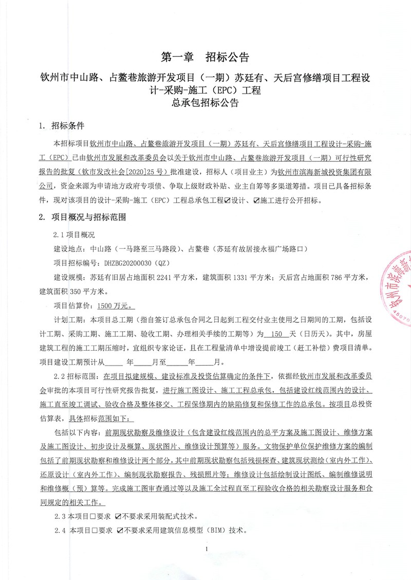 欽州市中山路、占鰲巷旅游開發(fā)項(xiàng)目(一期)蘇廷有、天后宮修繕項(xiàng)目工程設(shè)計(jì)-采購-施工(EPC)工程總承包招標(biāo)公告
