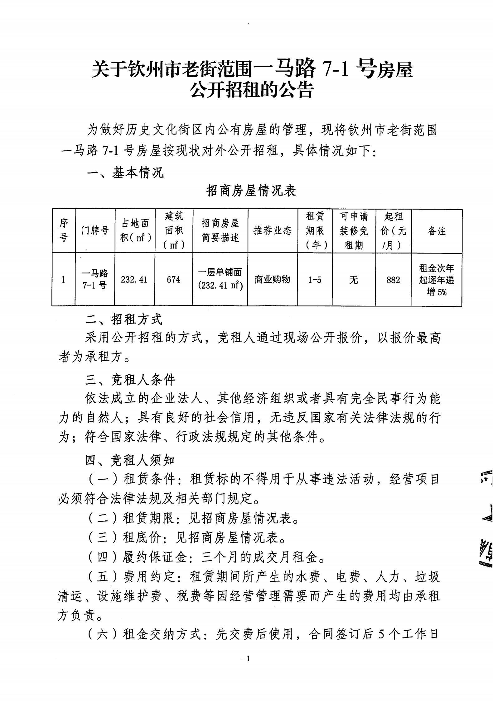 欽州市老街范圍一馬路7-1號房屋公開招租招租文件