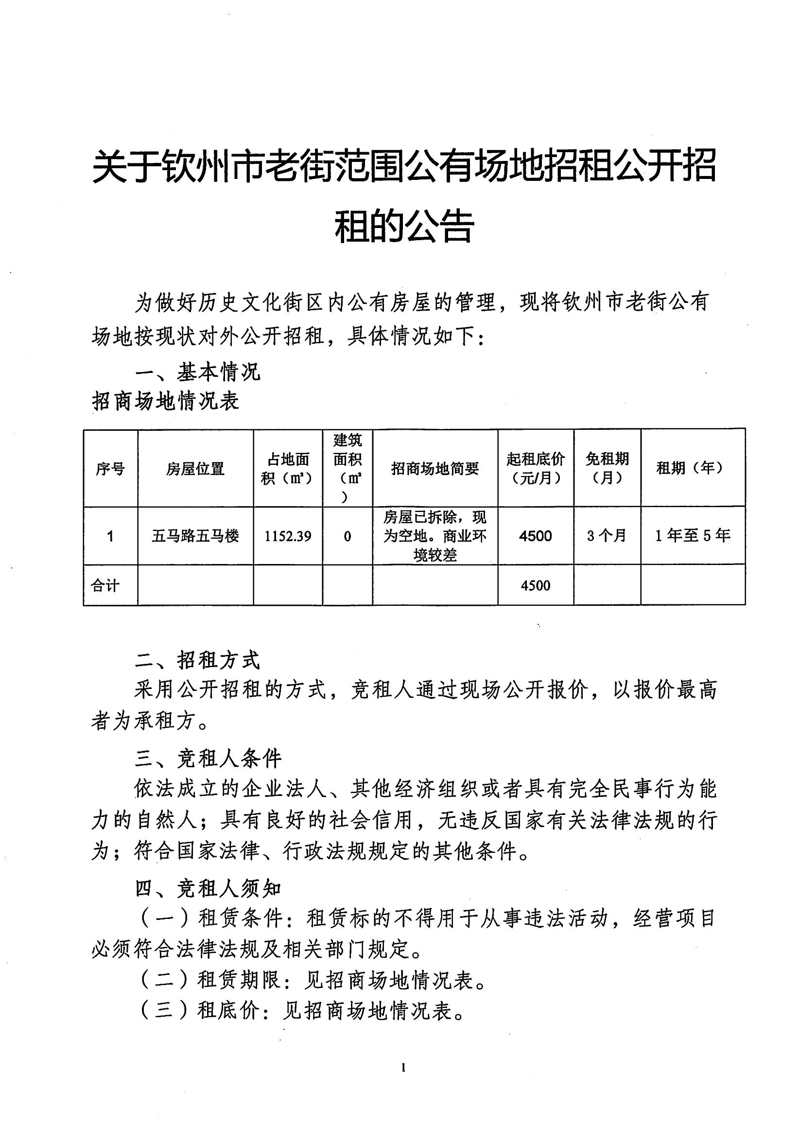 關(guān)于欽州市老街范圍公有房屋(場地)招租公開招租的公告